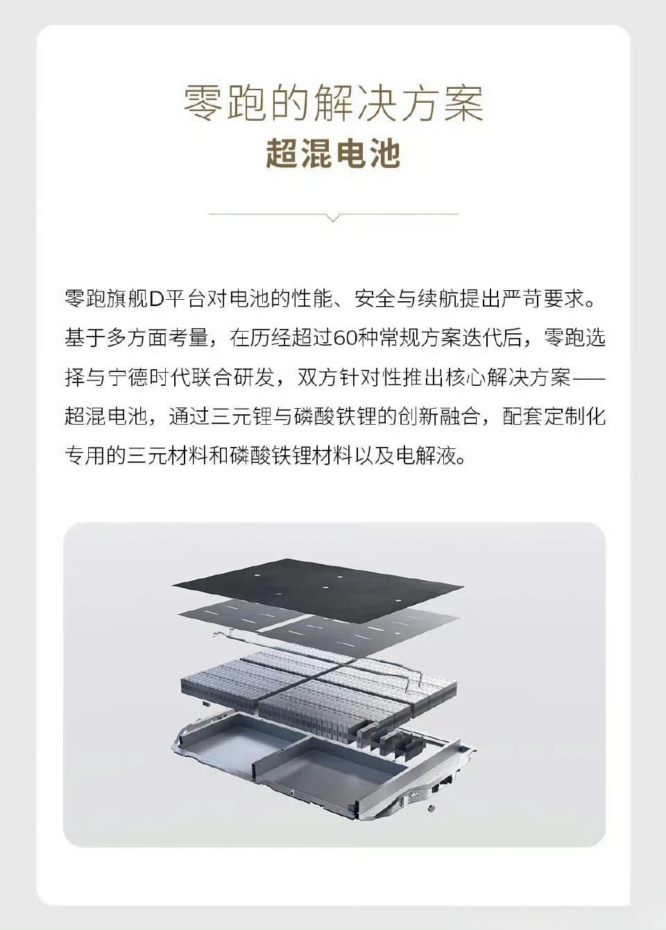上次讲了宁德时代跟零跑开发的新型电池——超混电池,磷酸铁锂和三元锂材料混合做正极材料。 —超混电池不像磷酸铁锂电池一样,需要定期充满校准。 —而且,宁德时代透露,零跑D19的这款新电池,如果使用习惯良好,比如每次充电到80%,以交流慢充为主,循环寿命可以到6000次以上,妥妥的长寿命电池。 —这是全球首款超混体系电池(LFP+NCM),能同时兼顾磷酸铁锂和三元锂的优势。 这么一看,零跑D19真有点东西。【来自懂车帝车友圈】