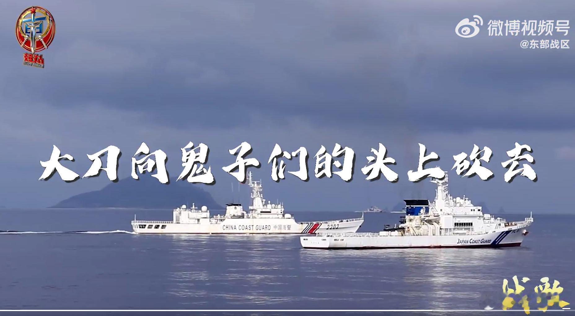 中国海警舰艇在钓鱼岛海域巡航执法的中方视角。图一中方舰艇舷侧为一艘日本海保石见级巡视船;图二为中国海警2202舰与海保国头级巡视船,远处背景可见中国海警5千吨级海巡型执法舰与一艘海保国头级巡视船。钓鱼岛态势