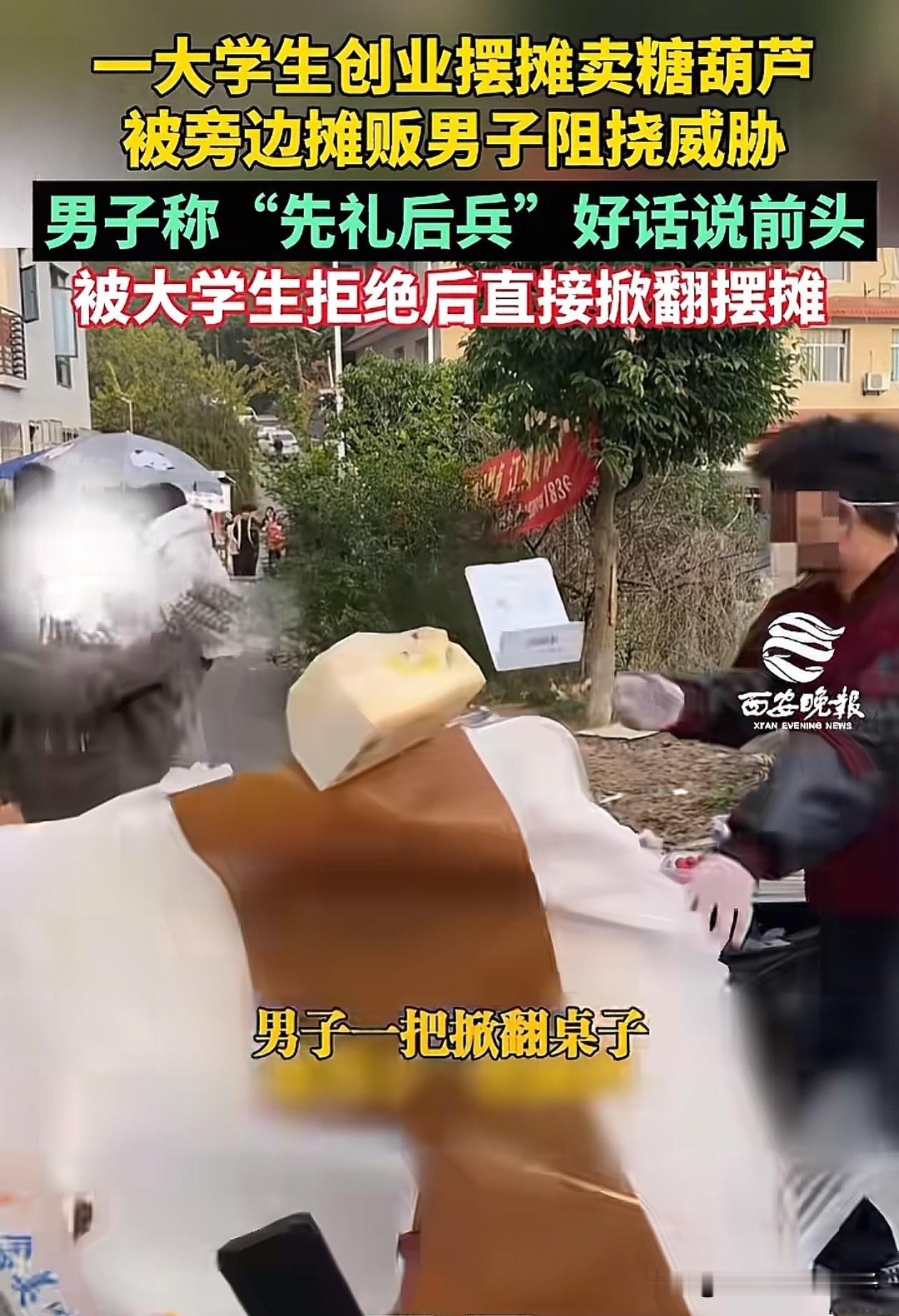 欺负大学生算什么本事!四川,一大学生利用业余时间摆摊卖糖葫芦,没想到刚把摊位支好,一男子就气势汹汹的走过来说:今天就算了,明天不准来了。 原来男子也在这里摆地摊,仗着自己摆摊的时间比较久,认为这个地方是他的专属位置,不允许别人在这个位置摆摊。 不过大学生并未理会男子,只是摆摆手拒绝了男子,表示不可能,男子见大学生如此不上道,继续说道:我今天先礼后兵,你再这样就别怪我了! 下一秒,男子直接动手把摊位掀翻了,锅里的糖浆洒了一地,气不过的大学生直接扑向了男子扭打起来,幸好围观的路人拉开了俩人。 后续,据知情人透露,在警察叔叔的调解下,男子现场向大学生道了歉,赔偿损失和修手机费用2000元,并保证以后不再为难他人摆摊。 男子确实太过分了,那个位置一看就是马路边,属于公共场合,应该讲个先来后到,难道就因为你用的久那块地就变成你的了,您觉得呢?
