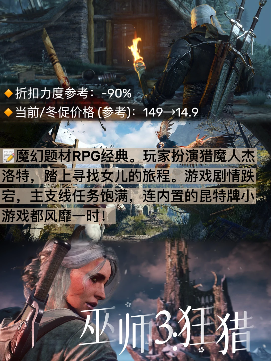 🔸📝魔幻题材RPG经典。玩家扮演猎魔人杰洛特,踏上寻找女儿的旅程。游戏剧情跌宕,主支线任务饱满,连内置昆特牌小游戏都风靡一时!