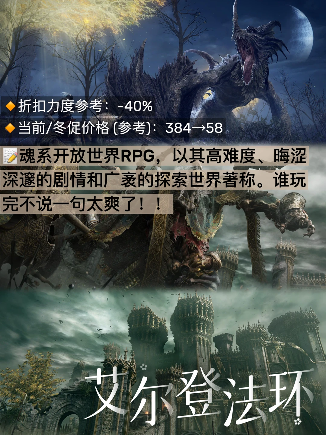 🔸📝魂系开放世界RPG,以其高难度、晦涩深邃的剧情和广袤的探索世界著称。谁玩完不说一句太爽了!