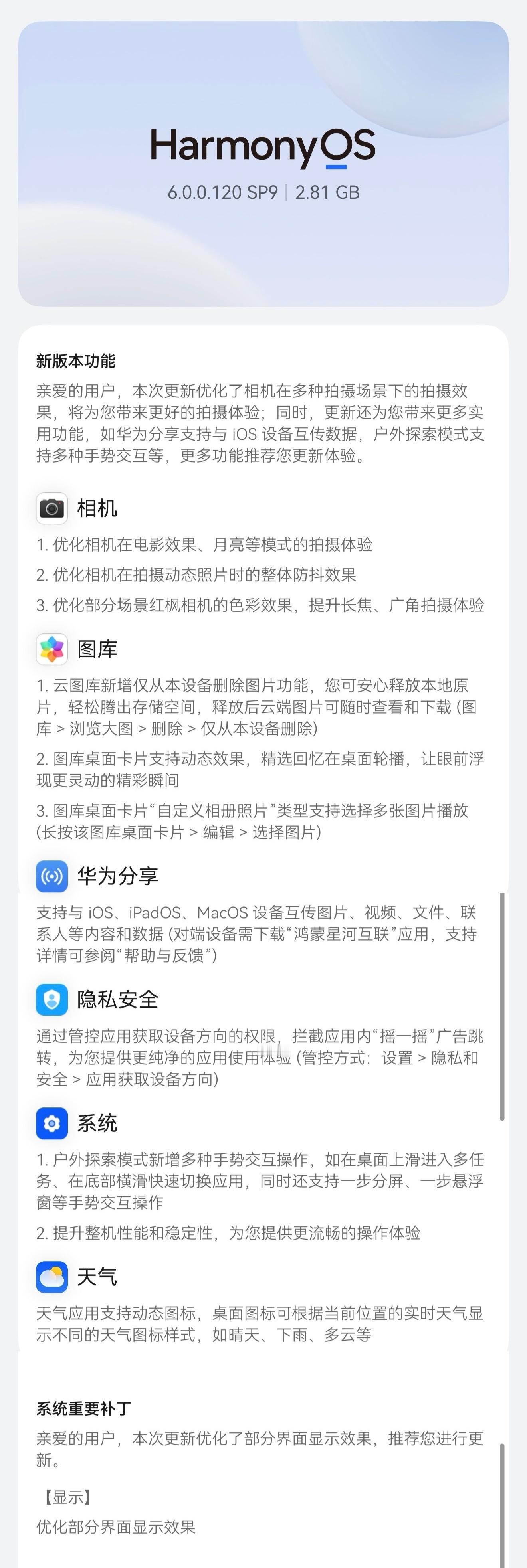 华为 Mate 80 今晚有新版本推送HarmonyOS 6.0.0.120 SP9 版本大家都收到了吗? 可靠的mate我的鸿蒙体验华为鸿蒙