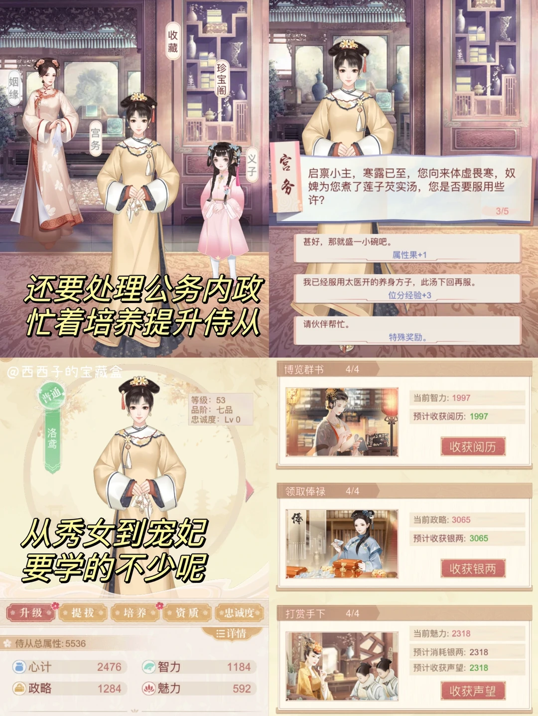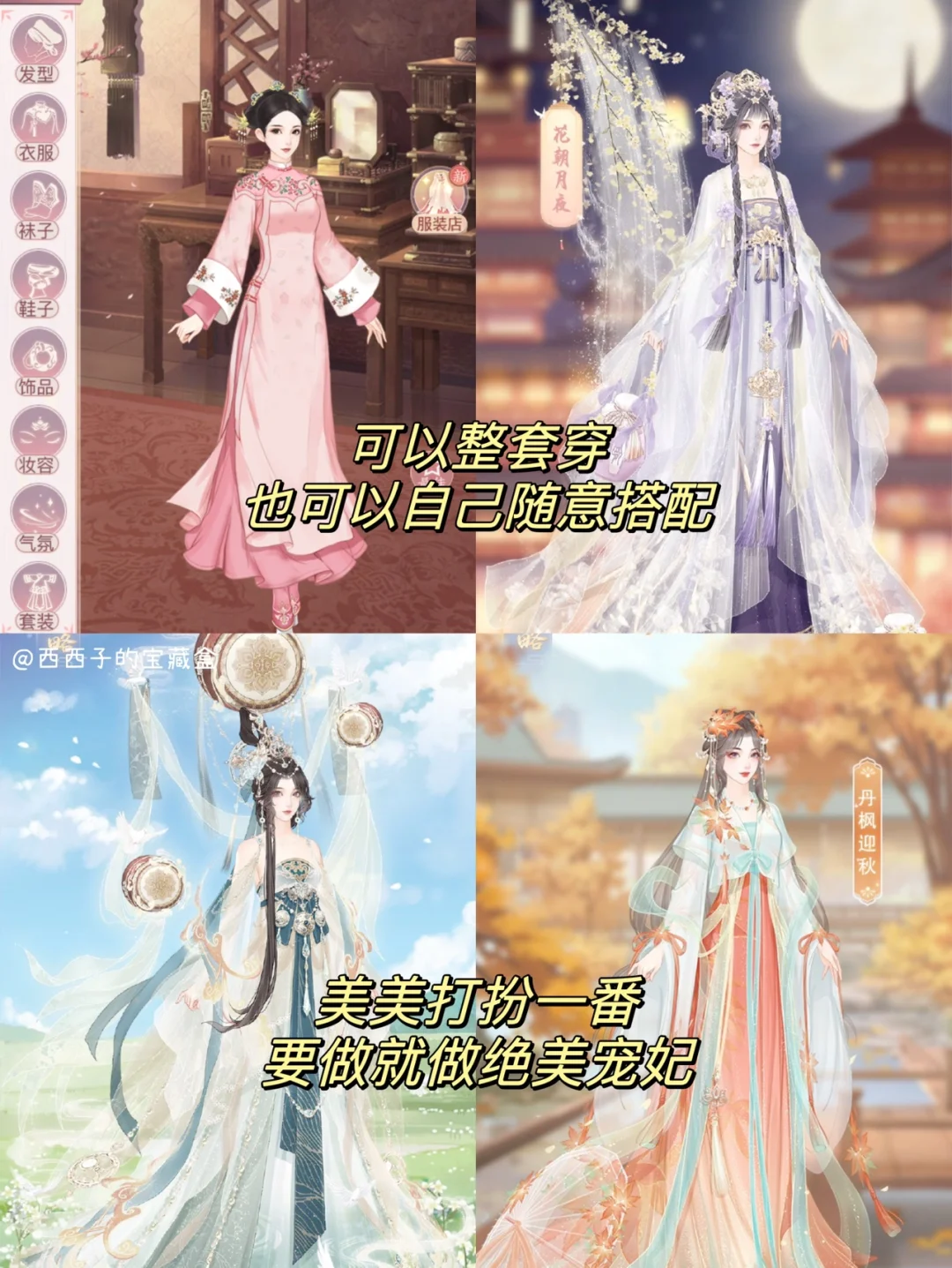 ✅这款游戏不止有宫斗玩法噢,还有服装搭配、DIY设计汉服、修寝宫等玩法,🌝悄咪咪的说,还有蓝颜知己噢~(嘿嘿,果郡王懂叭?)