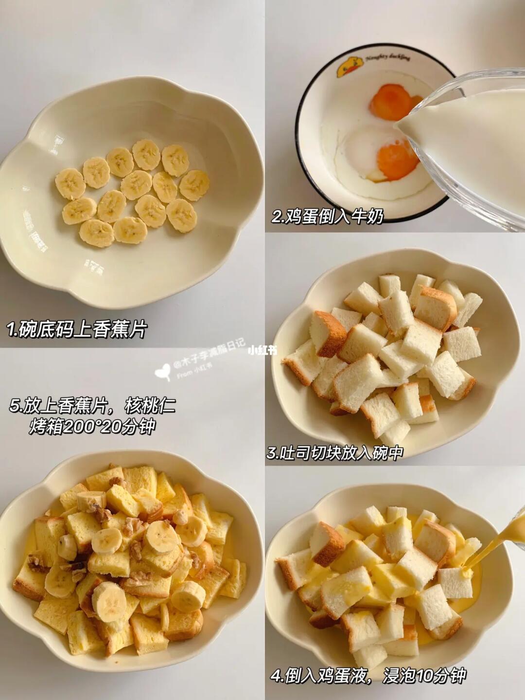 2022.5.4|减脂354天|减重29斤 🔹初始体重 120斤 🔸现重90斤 🔹目标85斤 🔸身高150cm —————————————————————— 🌤𝒢𝑜𝑜𝒹 𝑀𝑜𝓇𝓃𝒾𝓃𝑔 今天吃外酥里嫩的香蕉坚果烤吐司🍞低脂无油,减脂人安排起来~ —— 碗底铺上香蕉片,鸡蛋➕牛奶混合淋入切块的吐司上,顶部码上一些香蕉,核桃仁~把它们送进200°的烤箱20分钟后拿出来再撒上爱吃的坚果 🍞外层香脆内里软糯的口感再搭配嘎嘣脆的坚果颗粒,一口沦陷呀❗️