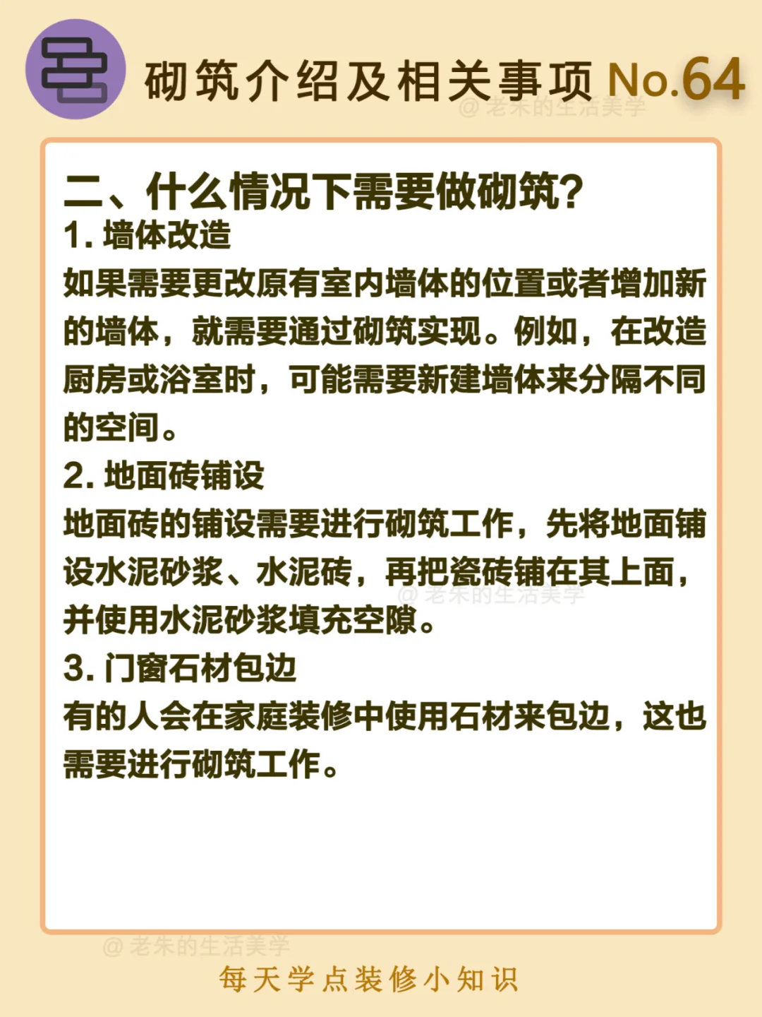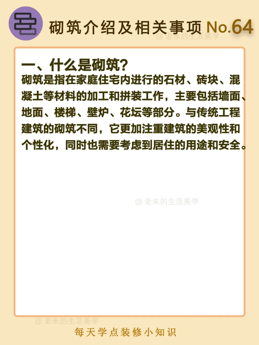 砌筑是指在家庭住宅内进行的石材、砖块、混凝土等材料的加工和拼装工作,主要包括墙面、地面、楼梯、壁炉、花坛等部分。与传统工程建筑的砌筑不同,它更加注重建筑的美观性和个性化,同时也需要考虑到居住的用途和安全。