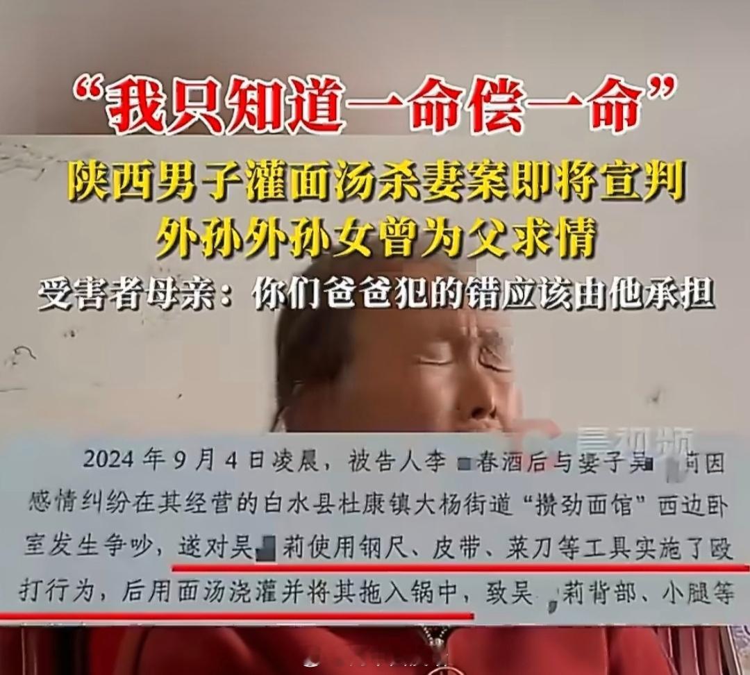 灌面汤杀妻案母亲称外孙曾为父求情灌面汤杀妻案中,外孙为父求情的情节令人痛心又复杂。其子女长期在家暴阴影与隔代抚养影响下成长——他们自幼疏离母亲,在恐惧与依赖中形成扭曲认知,其求情或许掺杂着被引导的成分。但子女的谅解不能掩盖凶手的残忍,更不能成为轻判的关键筹码。生命权至高无上,婚姻矛盾再深,也绝非灌面汤杀人的借口。司法量刑既要考量人情,更要坚守底线,严惩家暴型犯罪,才能彰显正义,也警示世人:暴力永远不能被纵容,任何过错都无权剥夺他人生命。