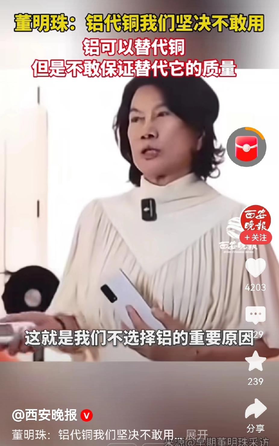 终于明白为啥董明珠恶评不少,但格力依然卖的很好。因为董明珠真的抓质量,不用铝代铜。 最近美的、海尔、小米等厂商推动“铝代铜”标准落地,甚至详细到禁止相互攻击了。 但这时候格力董明珠站出来了,说铝代铜坚决不敢用。铝可以替代铜,但不敢保证质量。 但凡有点常识的都知道,用铜做的电器,质量要比用铝做的要好得多。铝的性质比较活泼,过几年就容易氧化了。 关键是这些厂家用铝代铜,成本下去了,但电器价格也没下降多少。甚至他们还结成联盟,禁止相互攻击。 诚然,董明珠也有很多让人看不懂的骚操作,比如格力手机开机画面是自己、跨界造车亏损严重、自己设计空调外观被称为八十年代乡土风等等,但是她狠抓质量这一块,赢得了不少忠实的消费者。 由此可见,质量才是企业的生命,至于美的、海尔、小米真的挺让人失望的,以后买电器不再考虑这几个牌子了。