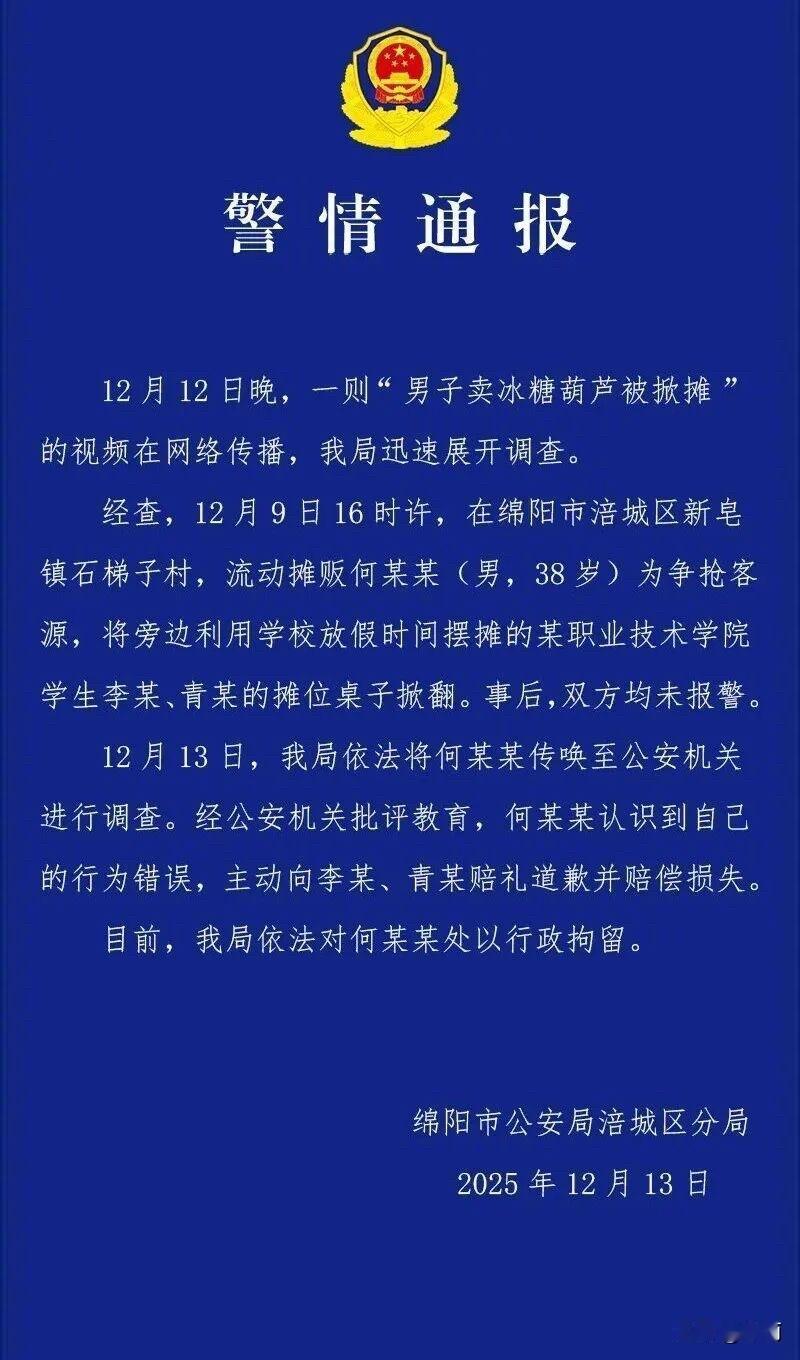 解气了。创业学生摆摊被同行掀翻摊位一事有结果了。警方已经对涉事商贩何某某进行了行