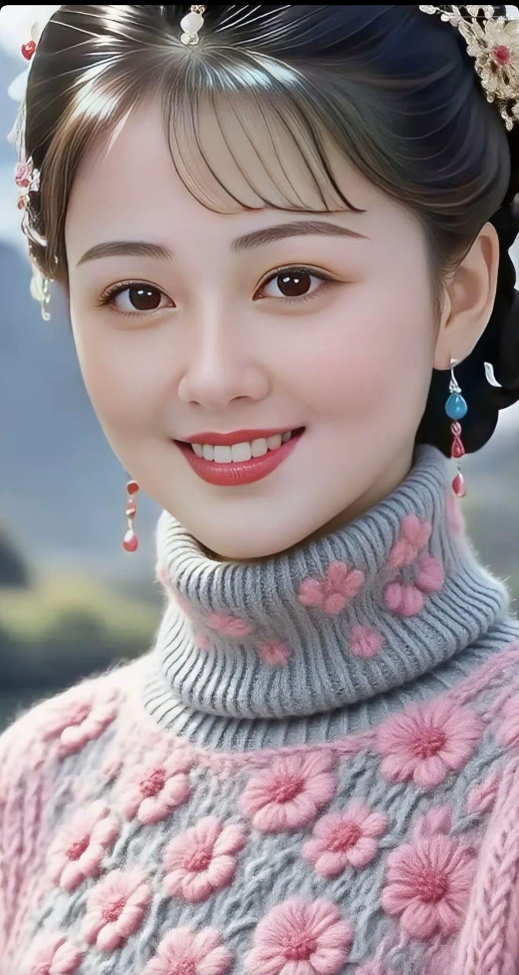 温柔甜美的古装少女,粉色花朵点缀的毛衣,让人心动不已!🌸💖