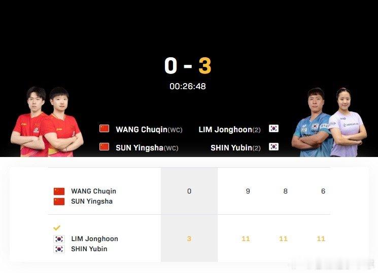 WTT总决赛混双决赛,王楚钦/孙颖莎对阵韩国组合林钟勋/申裕斌,最终一天三赛+带伤作战的孙颖莎搭档王楚钦,以0-3不敌对手,获得亚军。
