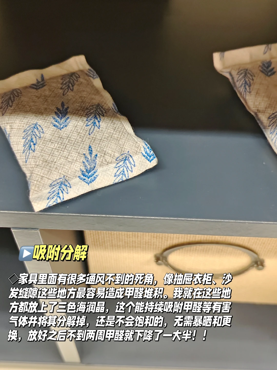 ◇家具里面有很多通风不到的死角,像抽屉衣柜、沙发缝隙这些地方最容易造成甲醛堆积。我就在这些地方都放上了三色海润晶,这个能持续吸附甲醛等有害气体并将其分解掉,还是不会饱和的,无需暴晒和更换,放好之后不到两周甲醛就下降了一大半!!