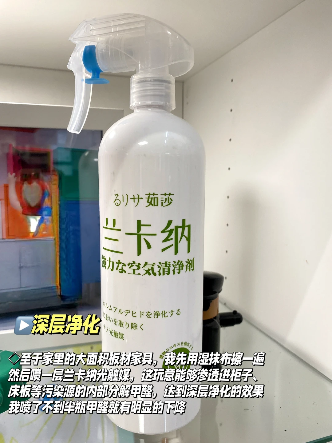 ◇至于家里的大面积板材家具,我先用湿抹布擦一遍,然后喷一层兰卡纳光触媒,这玩意能够渗透进柜子、床板等污染源的内部分解甲醛,达到深层净化的效果;我喷了不到半瓶甲醛就有明显的下降