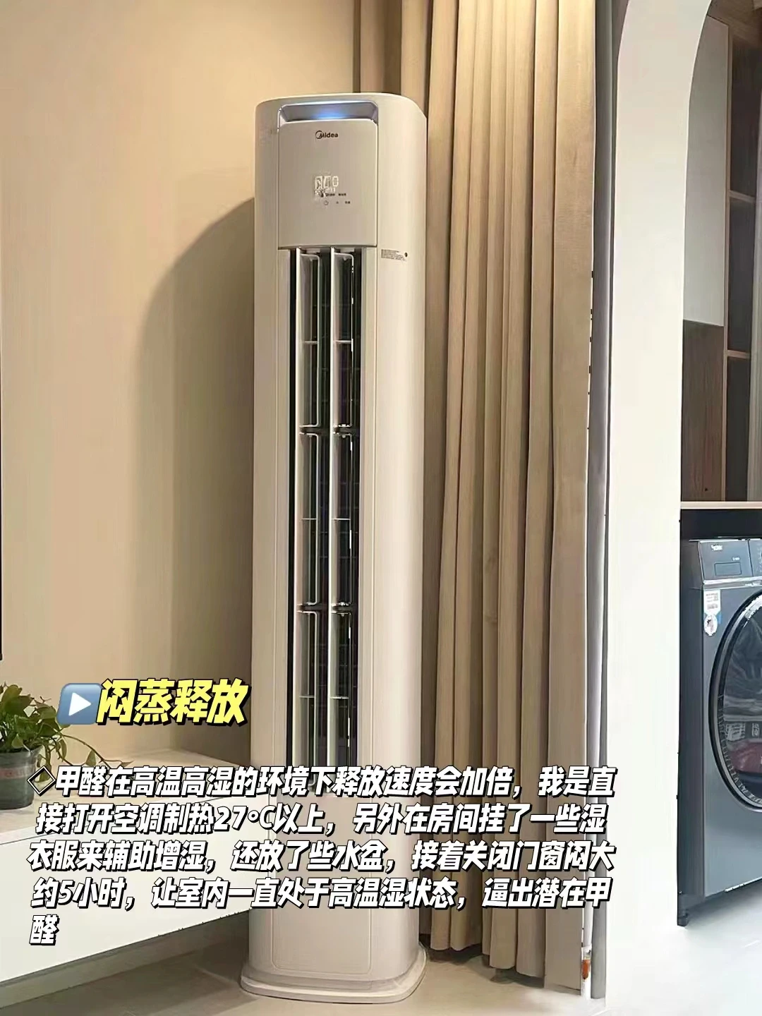 ◇甲醛在高温高湿的环境下释放速度会加倍,我是直接打开空调制热27°C以上,另外在房间挂了一些湿衣服来辅助增湿,还放了些水盆,接着关闭门窗闷大约5小时,让室内一直处于高温湿状态,逼出潜在甲醛
