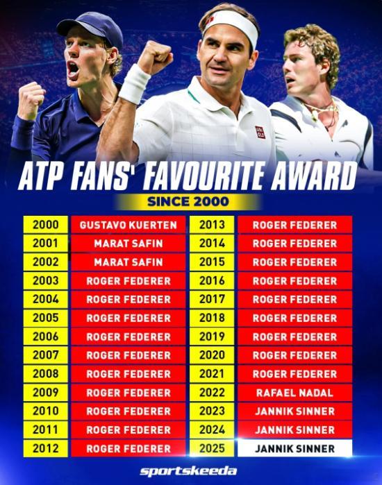 2000年来的ATP最受球迷欢迎奖,辛纳连续三年当选!热点现场