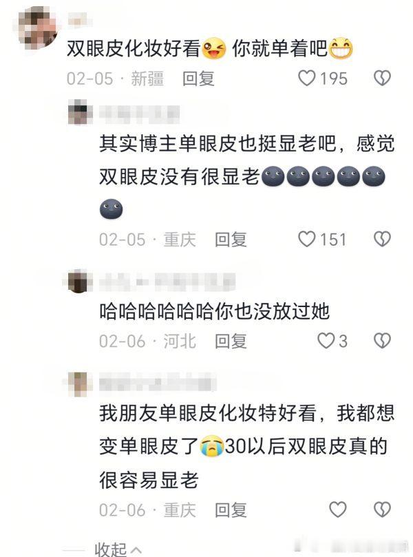起因是一个博主用了双眼皮特效觉得自己还是单眼皮好看,双眼皮显老。 结果一群人在博主单眼皮照片下面这样留言。我看了博主单眼皮也很好看啊。有必要恶意这么大吗??