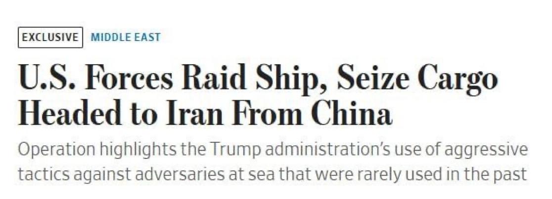 上个月,美国特种部队在印度洋登上了一艘船,并查获了与军事活动有关的部件,这些部件原本计划从中国运往伊朗。 据《华尔街日报》报道,这艘船在斯里兰卡数百英里外被拦截,船上的货物被没收并销毁,之后才被允许继续航行。