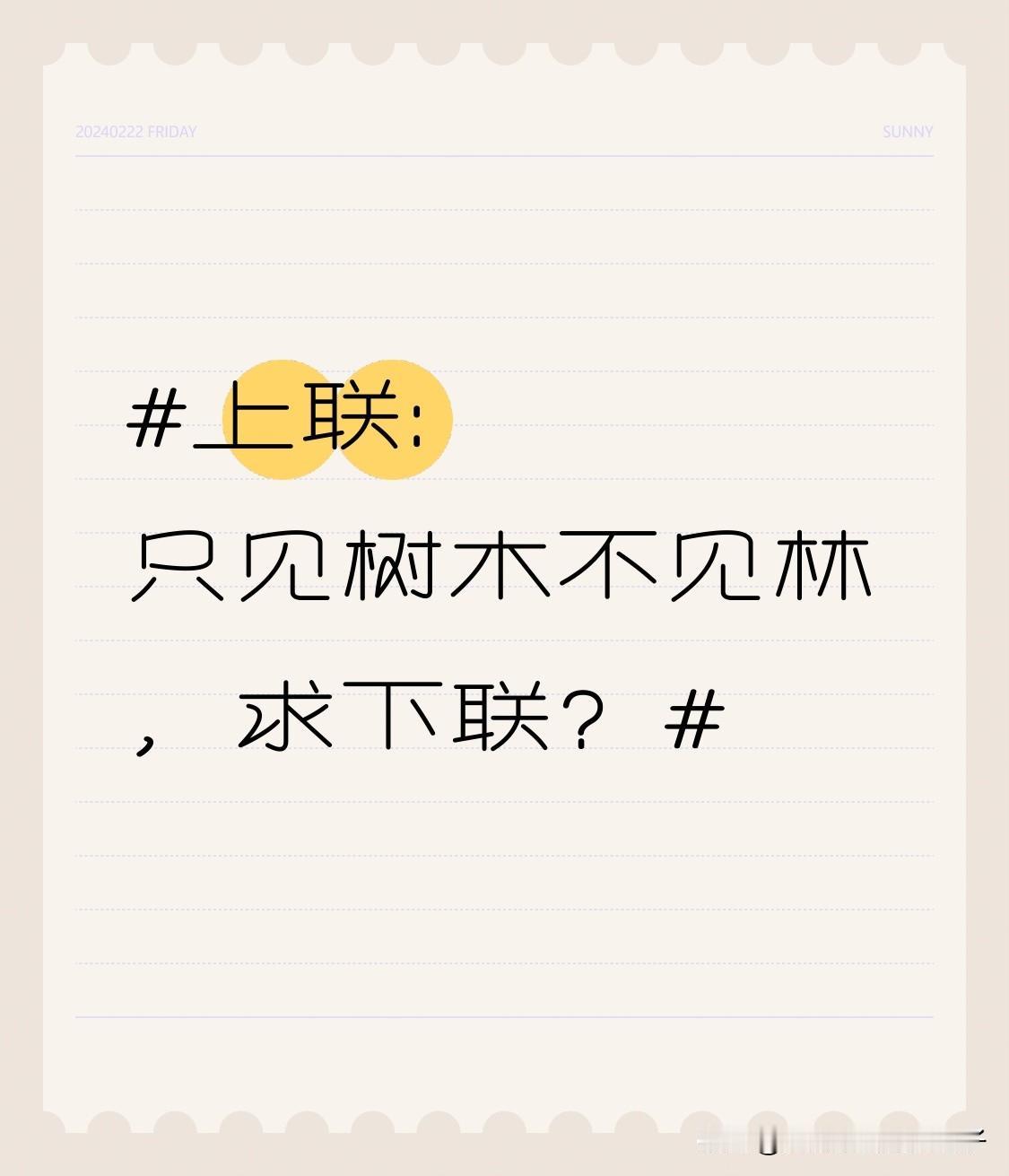 看到“只见树木不见林”这个上联,一下子就来了兴致。对联讲究对仗工整、平仄协调。这