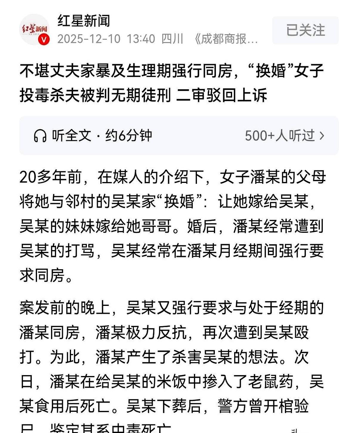有时候真觉得,一个女人的命,到底值个啥。 在她爹妈眼里,她就值一个嫂子。 就为了给三哥换个媳妇,24岁的她,像个物件一样,被“换”给了邻村一个男人。 那根本不是过日子,是渡劫。 那个所谓的丈夫,是个烂人,赌钱,家暴,拳头比话多。 最让人恶心的是什么你知道吗?是她来例假,身体最难受的时候,那畜生也要强来,不从,就往死里打。 这种日子,她过了一年。 一年,365天。 终于有一天,又是干活慢了被骂,又是晚上被毒打。 天亮了,她没哭也没闹。 只是平静地走进厨房,在饭里,下了早就准备好的老鼠药。 然后,她就跑了。 这一跑,就是27年。 这27年里,她换了个名字,嫁了个正常人,生了孩子,锅碗瓢盆,柴米油盐,过上了她24岁时做梦都不敢想的日子。 我猜,她可能都快忘了自己是谁了。 但法网恢恢。 警察找到她的时候,她都快50了。 最终判了无期。 杀人偿命,法律上一点毛病没有。 可我心里就是堵得慌。 她用一瞬间的恶,终结了日复一日的恶。 你说,这到底是她一个人的悲剧,还是那个时代的悲剧?