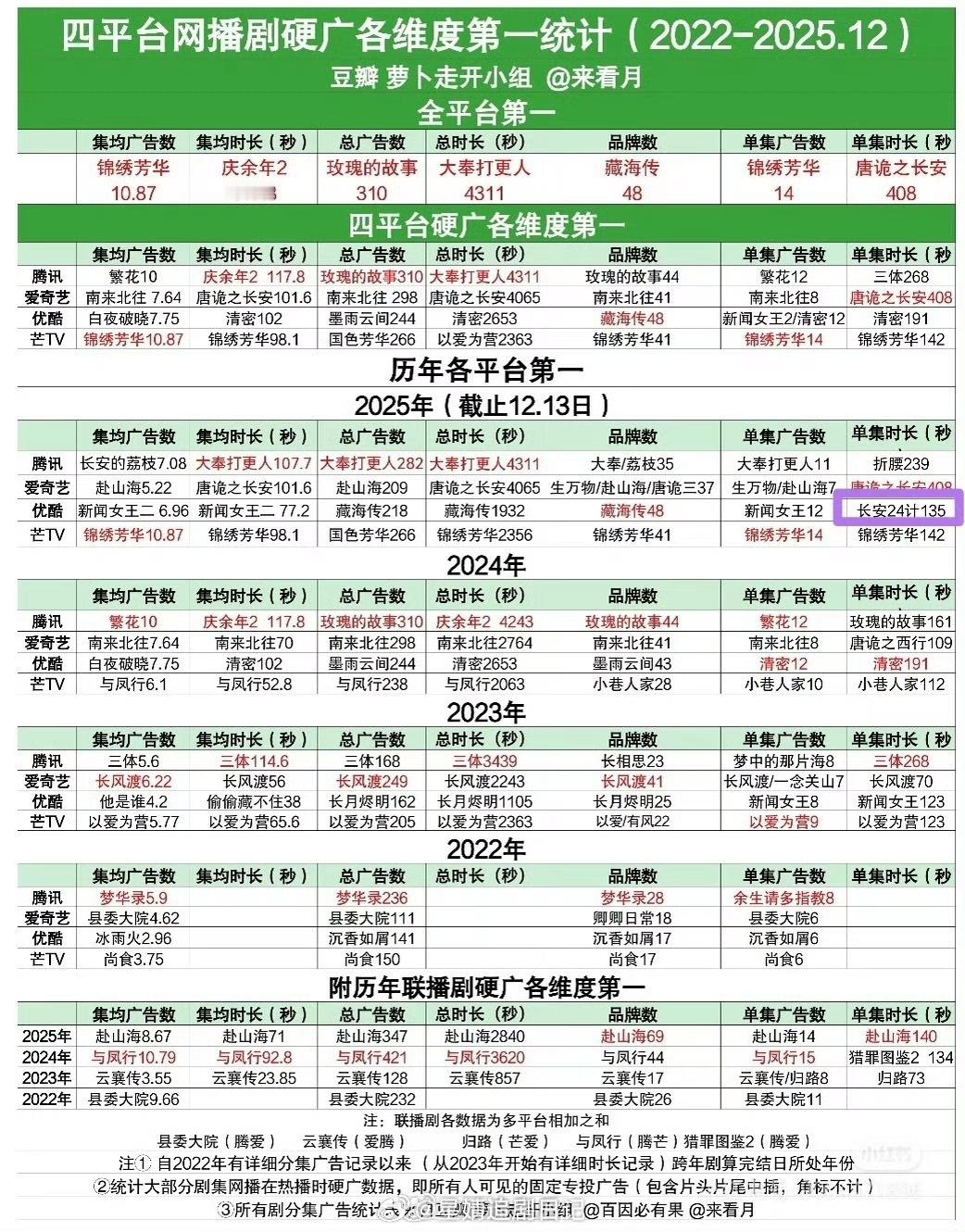 四平台剧网播硬广自2022至今各维度第一统计集均广告数、单集广告数双第一 锦绣芳华 杨紫集均时长第一 庆余年2 张若昀总广告数第一 玫瑰的故事 刘亦菲总时长第一 大奉打更人 王鹤棣品牌数第一 藏海传 肖战单集时长第一 唐诡之长安 杨旭文