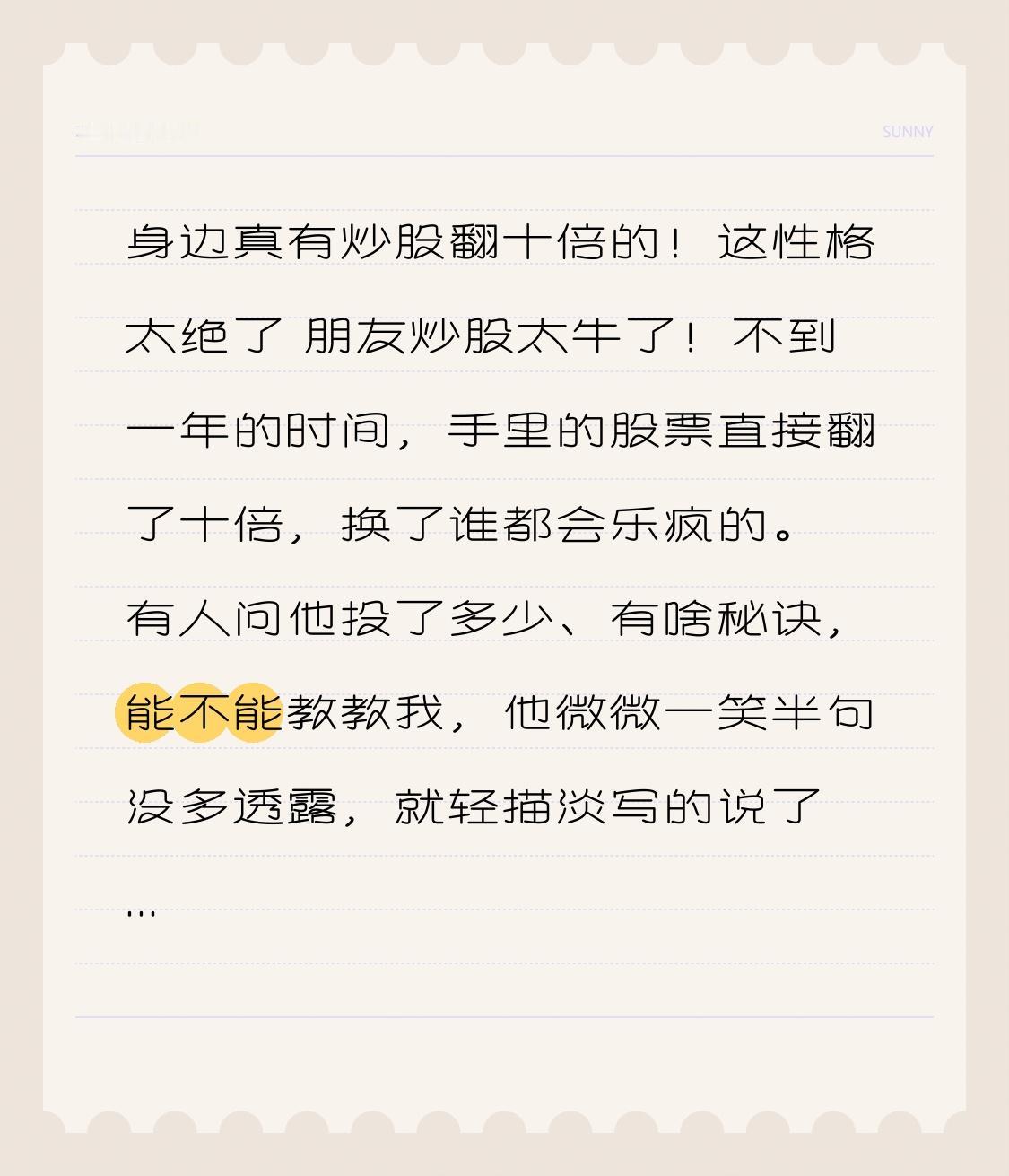 炒股一年翻十倍,你们信吗? 朋友炒股太牛了!不到一年的时间,手里的股票直接翻了十倍,换了谁都会乐疯的。 有人问他投了多少、有啥秘诀,能不能教教我,他微微一笑半句没多透露,就轻描淡写的说了一句“这只票可以跟”。 有人听了,果断买入,后来偷偷赚翻;也有人没当回事,看着别人盈利,后悔得直跺脚。 其实这朋友平时特低调,炒股赚了亏了从不在外面说。说实话,就这沉得住气的性子,不赚钱都难! 炒股就是这样,稳住才能发大财,急性子的人是赚不到钱的,因为很容易犯追涨杀跌的毛病,你们怎么认为?评论区留言讨论,炒股经验 普通人炒股