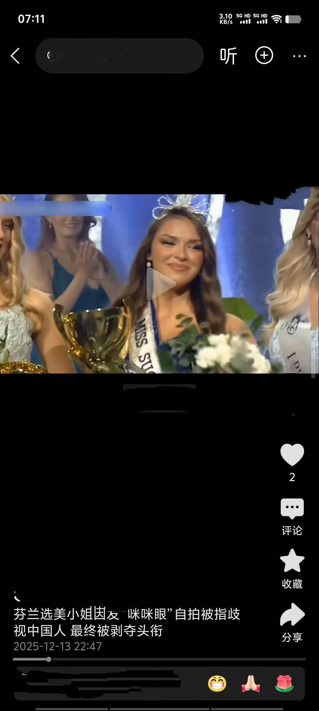 2025年12月,芬兰小姐莎拉·扎夫斯在社交媒体发布拉眼角自拍,配文“去吃中餐”,引发种族歧视争议。尽管她辩解是因头痛揉眼,但舆论不买账。最终,她被剥夺头衔,亚军递补,此事也引发对种族歧视的广泛谴责。