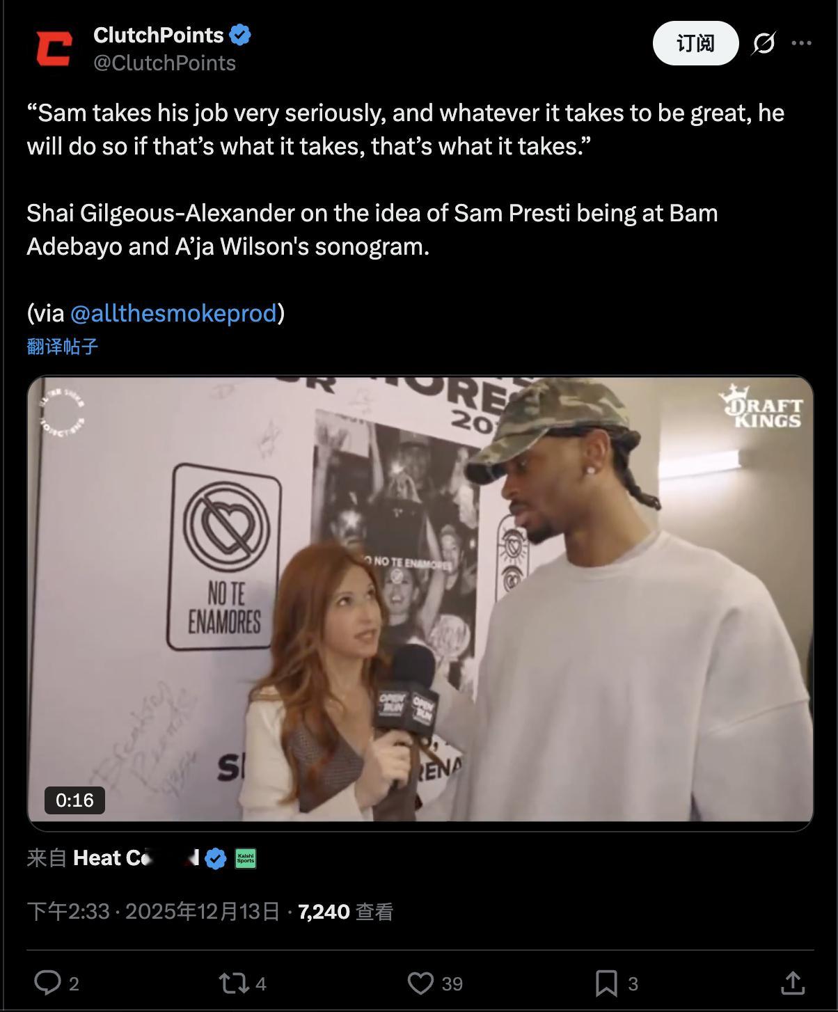 亚历山大今天被问到最近外网很火的一个梗:普雷斯蒂是否会陪同阿德巴约和WNBA巨星阿贾威尔逊的宝宝做超声波检查?他回答道:“普总工作兢兢业业,为了成功他什么都愿意做的。如果他必须去的话,那他肯定会去的。”编辑by小魏雷霆阿德巴约太拉了阿贾威尔逊四夺常规赛mvp