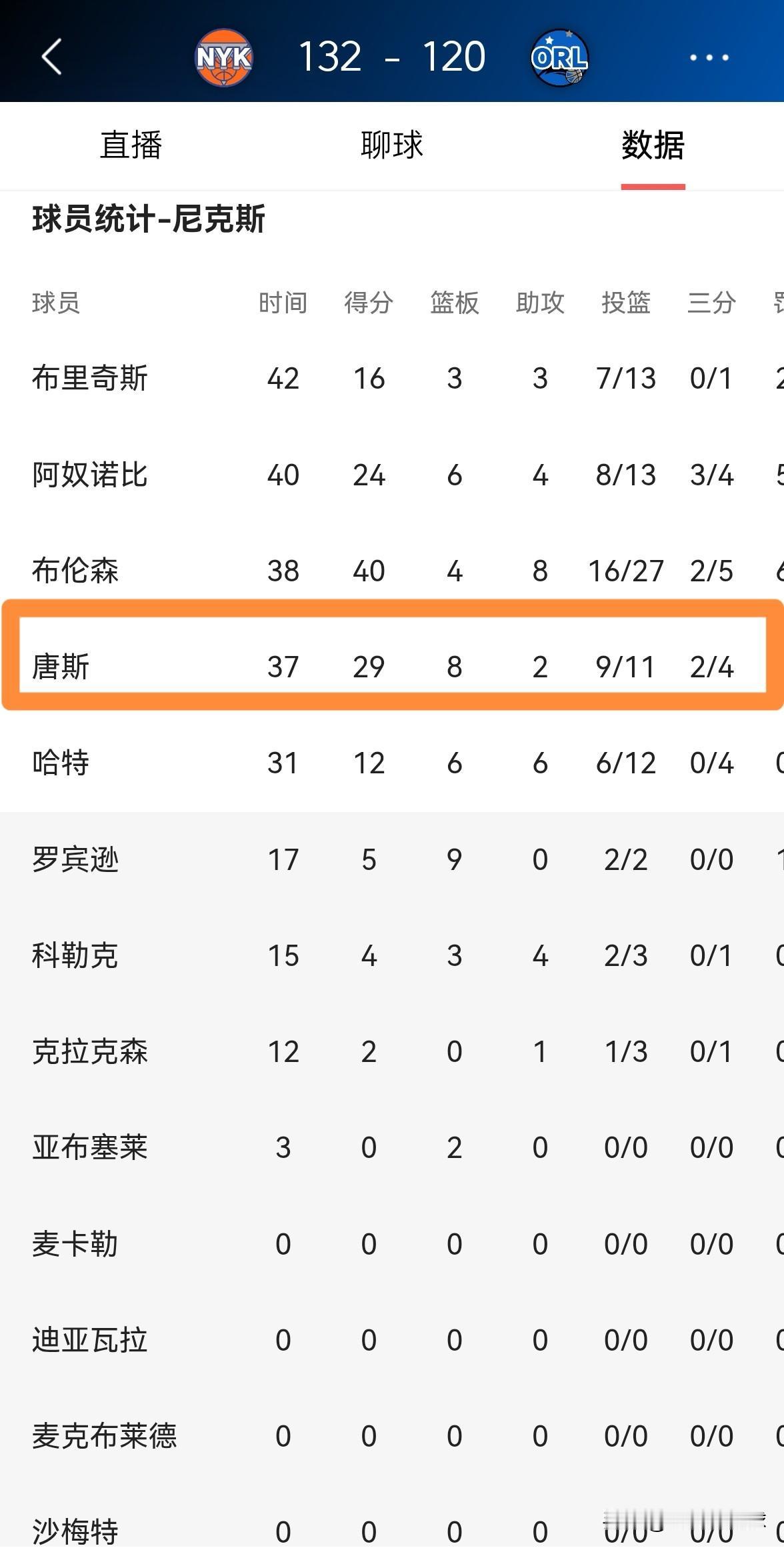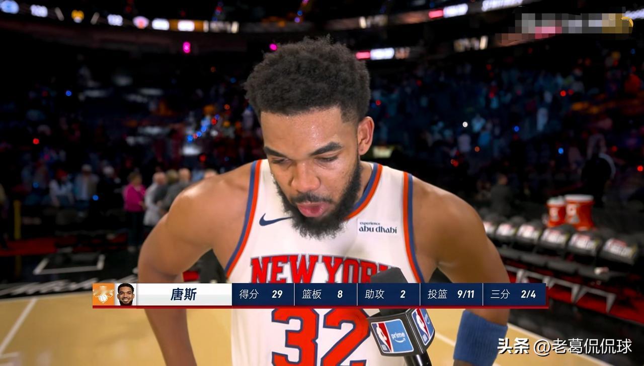 尼克斯当家中锋唐斯真是太强硬了!在今天尼克斯以132:120击败魔术的NBA杯半决赛中,唐斯在攻防两端都展现出了超强的侵略性。 全场比赛下来,唐斯首发出战37分钟,投篮11中9,其中三分球4中2、罚球10中9非常高效的砍下29分8篮板2助攻1抢断1盖帽,他的场上正负值为+12。 坦白说,尼克斯之所以能够杀进NBA杯决赛,唐斯绝对是功不可没。