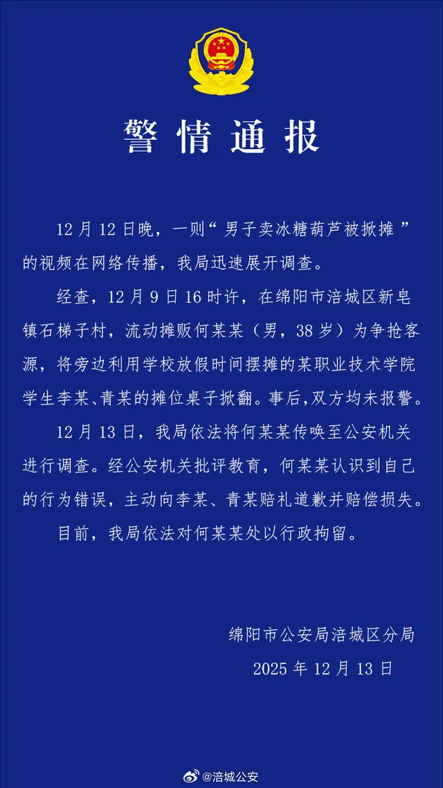 #警方通报男子卖冰糖葫芦被掀摊#两名学生在假期想通过社会实践上课,没想到被社会实践给上了一课!我的小区门口,有一个老太太做手工菜馍,需要等很久才能做好一个,我有时候买,都觉得心疼的慌。后来有一段时间,老太太没出摊,有一个不大的中年人在那里卖菜馍,我还以为是老太太的儿子,就一边买一边向他打听老太太的情况,谁料想,他不是老太太的儿子,而是老太太的竞争对手,说老太太用的菜杂七杂八,都是便宜的菜——我觉得是老太太的创新,而且口感也更好——说自己用的菜好……我一边等着一边内心五味杂陈,哎,出摊卖个人工菜馍啊。再回看新闻里,就因为两个职业学校的学生赶在假期卖个冰糖葫芦,结果被原来的摊贩直接“先礼后兵”的给掀翻了,请注意,在掀翻他人小摊的何某某看来,这还是先礼后兵,文明的体现。哎,五味杂陈。#热点解读#