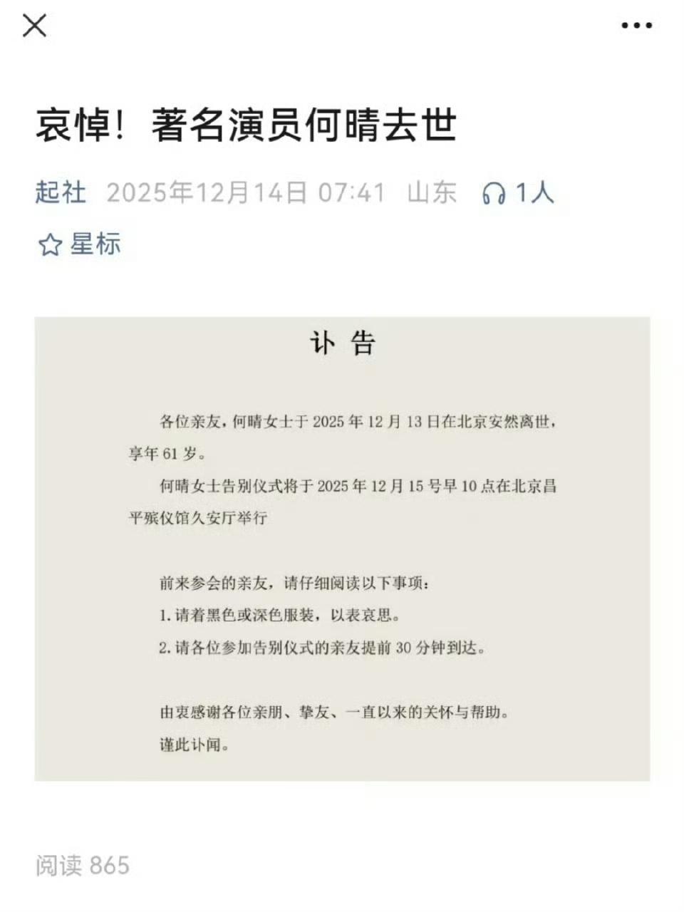 演员何晴离世?网络上一则讣告显示,何晴于2025年12月13日离世。 自古美人如名将 不许人间见白头。她是琼瑶剧中美丽动人的华又琳,是《情剑山河》里的国破家亡的大周后。 四大名著中,她塑造的《三国演义》中的大乔、《西游记》中的怜怜、《红楼梦》里的秦可卿,以及《水浒传》中的李师师,无一不是令人惊艳的红颜。 今年对于美貌的中年女演员而言,着实流年不利。先是朱媛媛,如今又是何晴。