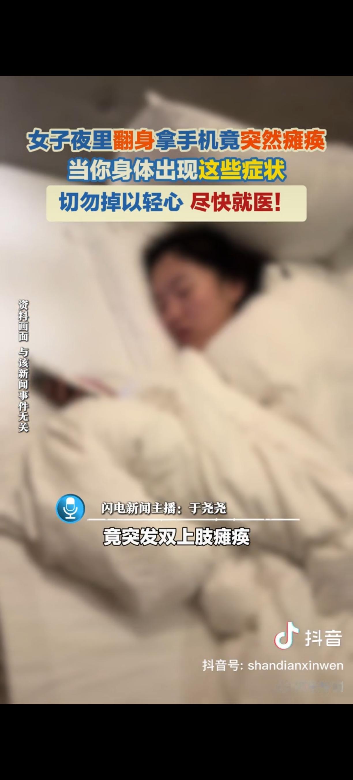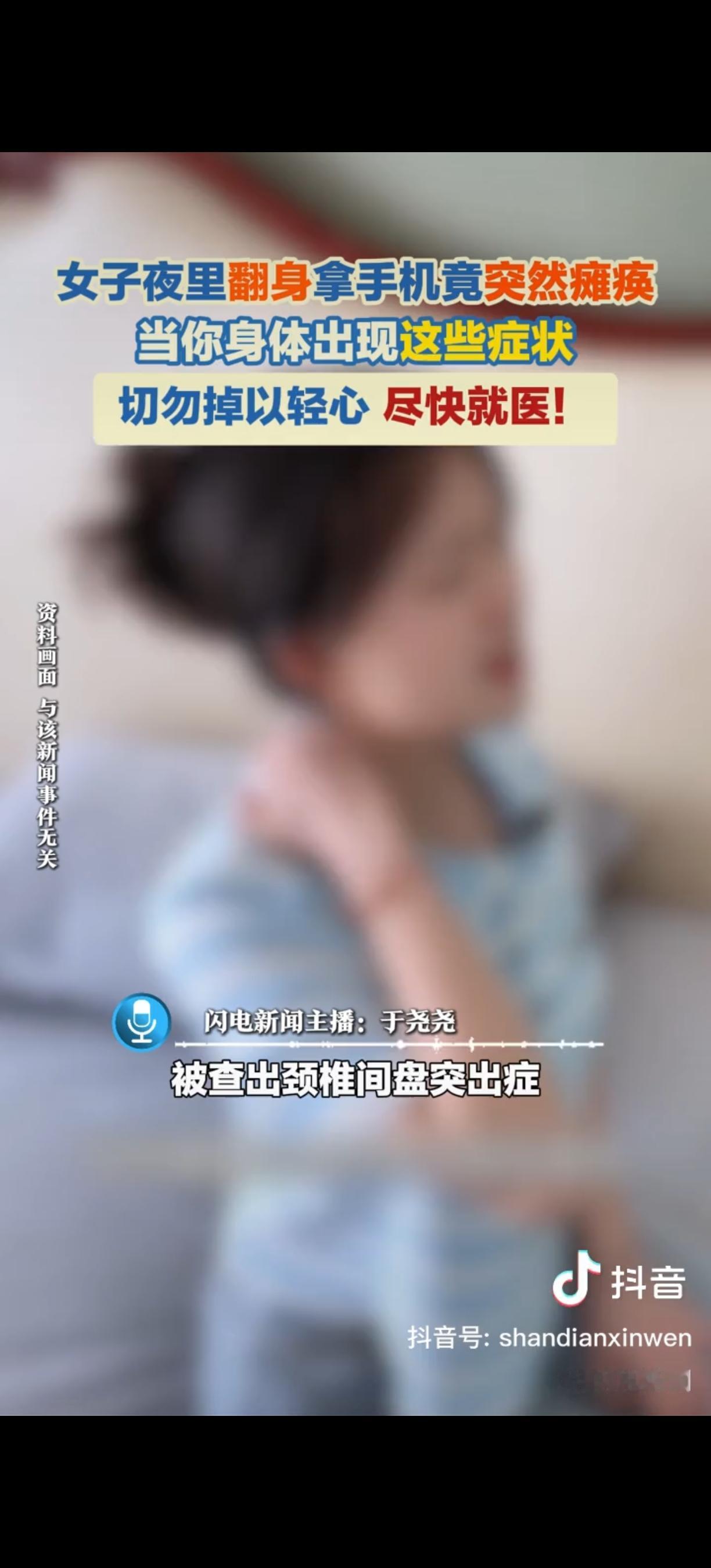 “悲剧还是发生了!”近日,福建泉州,一女子前往医院检查,被确诊为颈椎间盘突出症,医生建议她尽快手术,但但女子坚持保守治疗,当晚,女子在床上翻身拿手机时,双手突然失去知觉,送去医院治疗发现已经瘫痪。网友:这下后悔了吧! 王女士今年五十多岁,平时没事就爱躺在床上刷手机,一刷就是好几个小时。前段时间,她总觉得手麻、脖子酸,以为是累着了,没当回事。直到实在疼得受不了,才去医院检查,结果查出了颈椎间盘突出症。 医生看完检查结果,严肃地告诉她,她的病情挺严重,得赶紧手术,不然可能会瘫痪。可王女士一听要手术,就有点害怕,觉得保守治疗敷敷药、做个按摩也能好,就没听医生的话。 没想到,就在会诊的当天晚上,她躺在床上翻身拿手机,就那么一个简单的动作,双手突然没了知觉,连抬手的力气都没有了。家人赶紧把她送到医院,医生检查后说,她这是瘫痪了。 原来,她翻身的时候,突出的椎间盘突然压迫到了脊髓神经,这才引发了急性症状。医生说,要是她当时听了建议赶紧手术,也不会变成现在这样。 这事传到网上,大家议论纷纷。有人说她太固执,不听医生的话,现在后悔也晚了。也有人觉得,手术确实有风险,换谁都会犹豫。还有人想起自己也经常低头玩手机,脖子也不舒服,心里直犯嘀咕。 其实颈椎问题现在特别普遍,很多人都觉得自己年轻,扛一扛就过去了。可身体发出的警告信号,真不能忽视。就像王女士这样,一开始只是手麻脖子酸,没重视,最后导致瘫痪,多不值当。 咱们平时得注意保护颈椎,别老是低头看手机,坐一会儿就起来活动活动。要是身体真出现了脖子疼、手麻这些症状,可千万别拖着,赶紧去医院看看,听医生的话,该治疗就治疗,别等出了大事再后悔。 各位读者你们怎么看?欢迎在评论区讨论。 来源:闪电新闻 2025-12-12报道