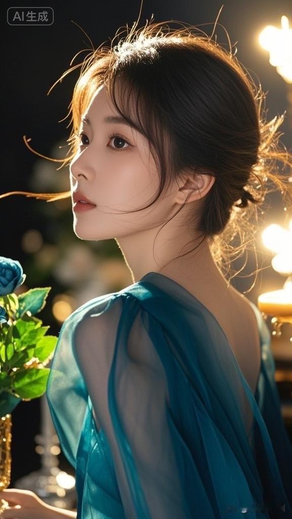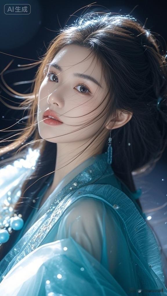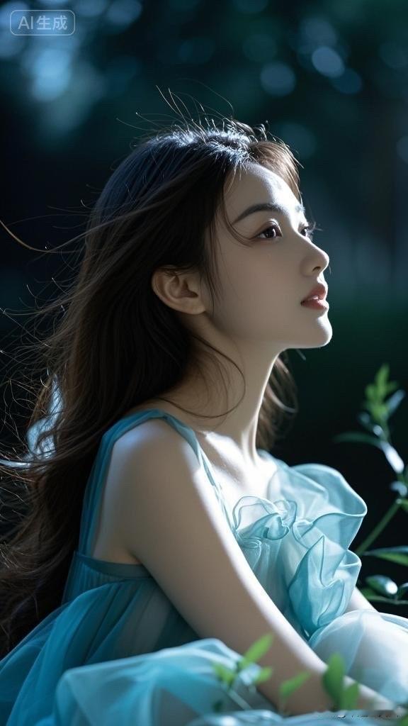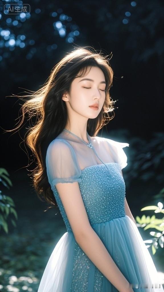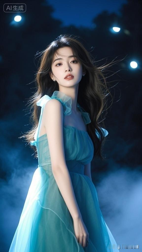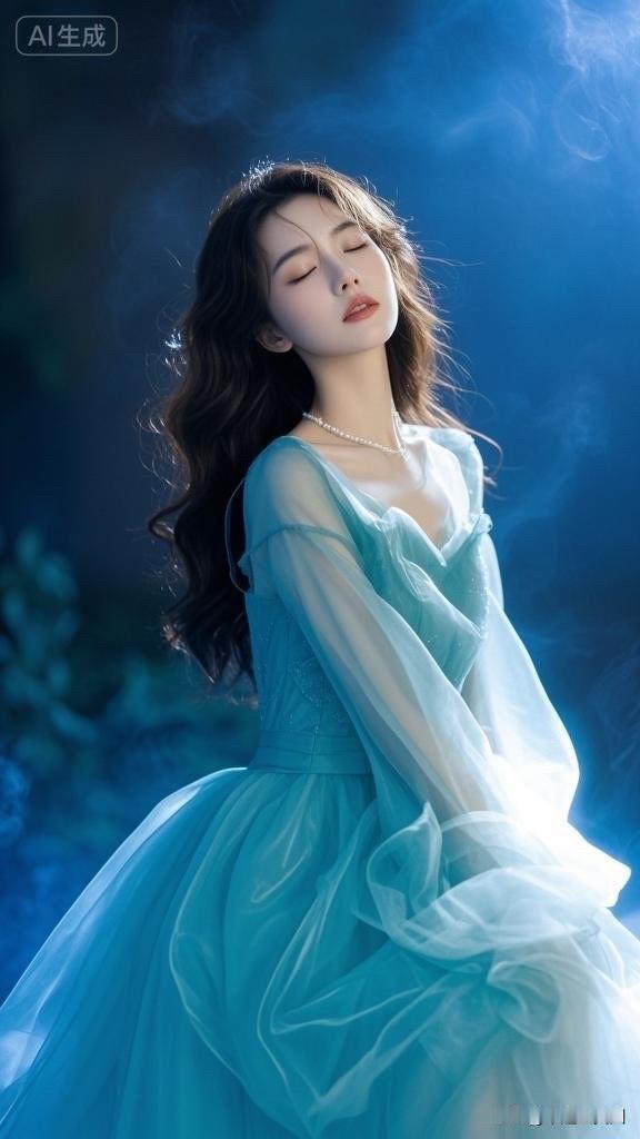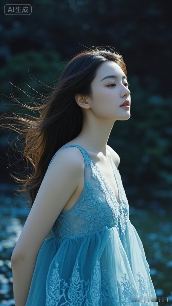 梦幻蓝裙少女,风中飘逸,如梦如幻。