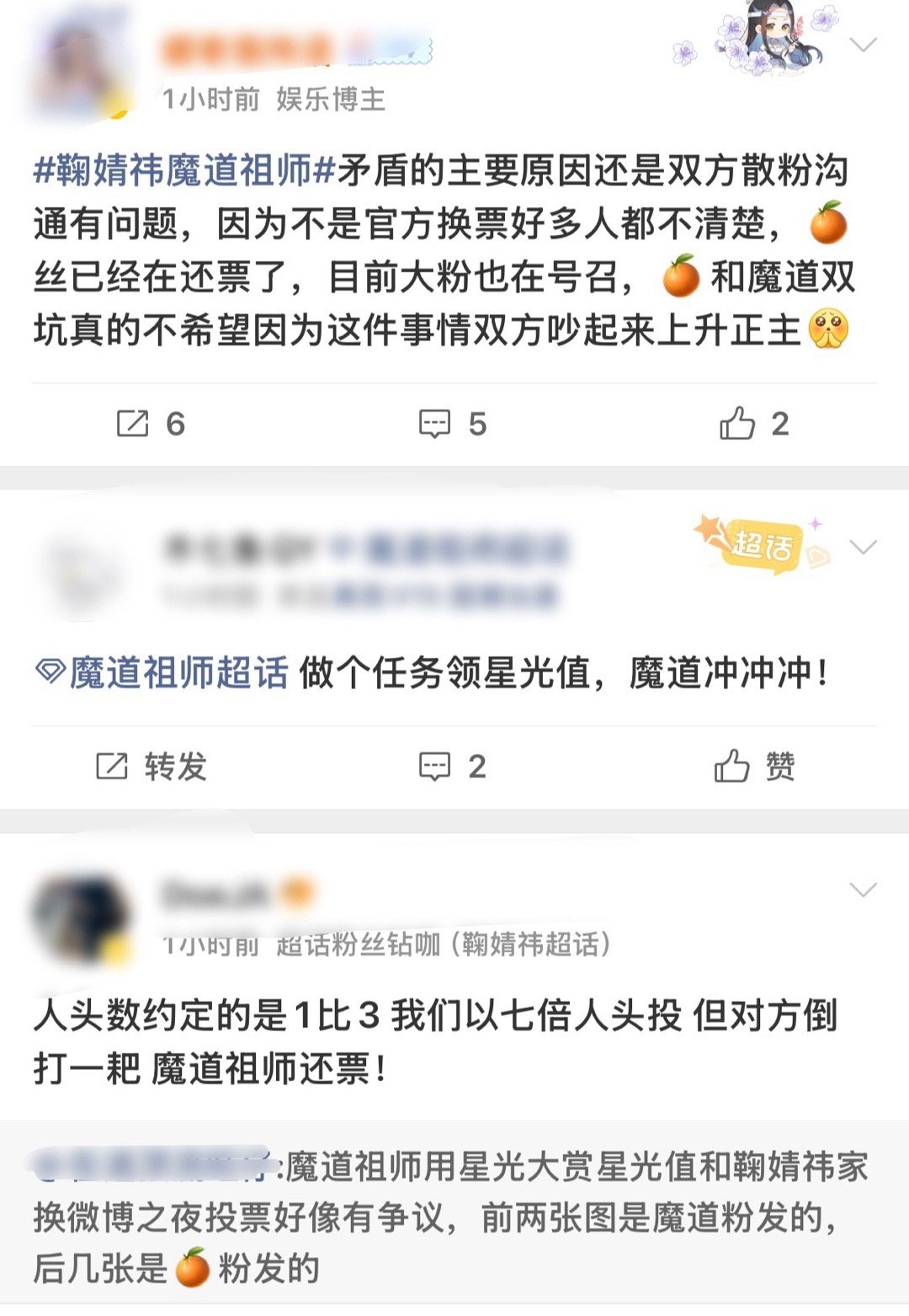 鞠婧祎和魔道祖师 因为星光大赏和微博之夜换票交流起来了,好像是双方管理没沟通好?