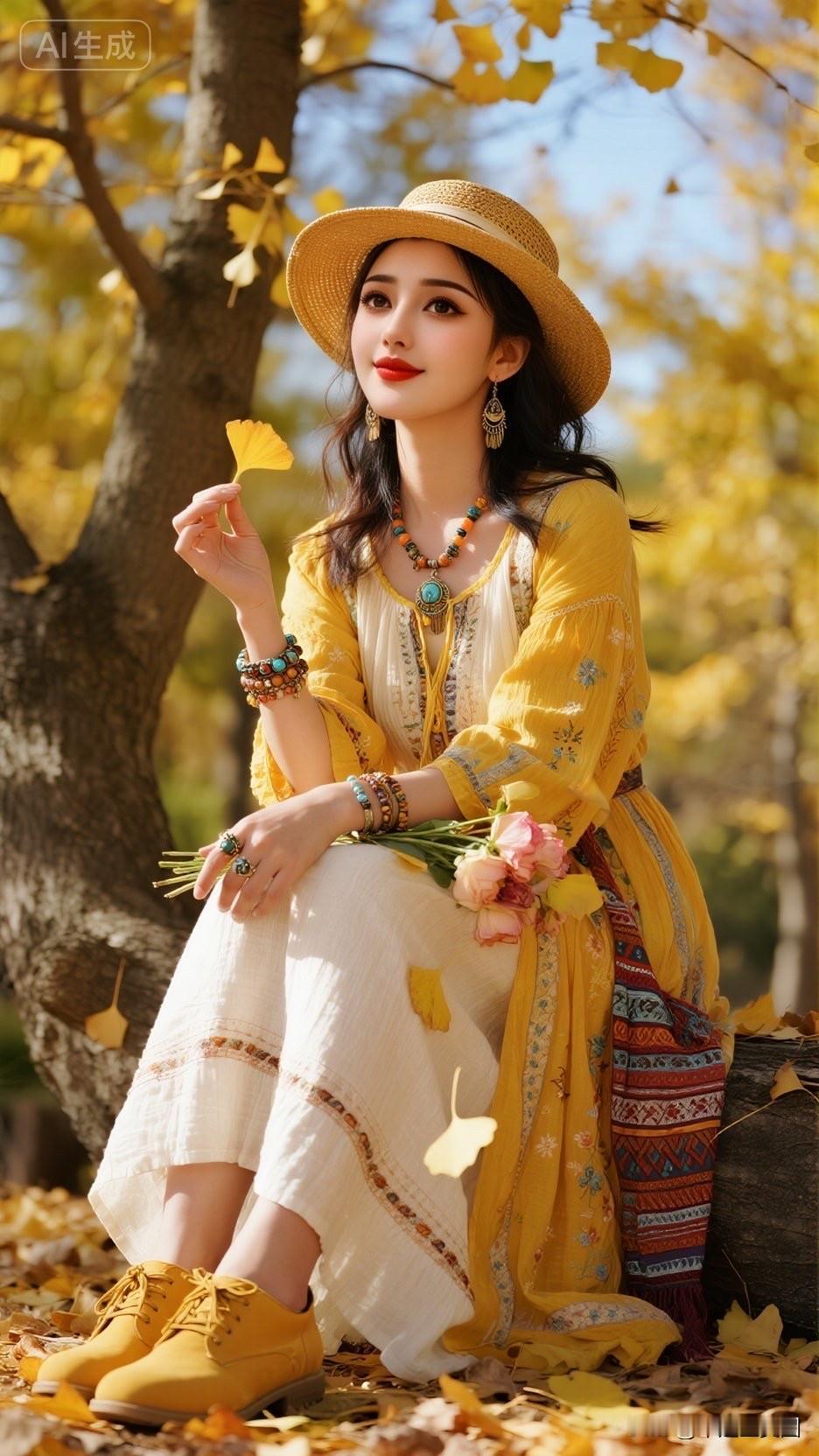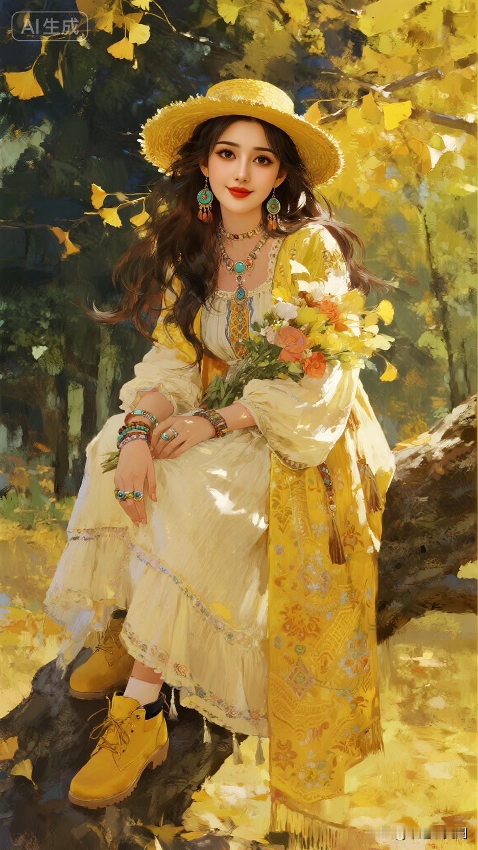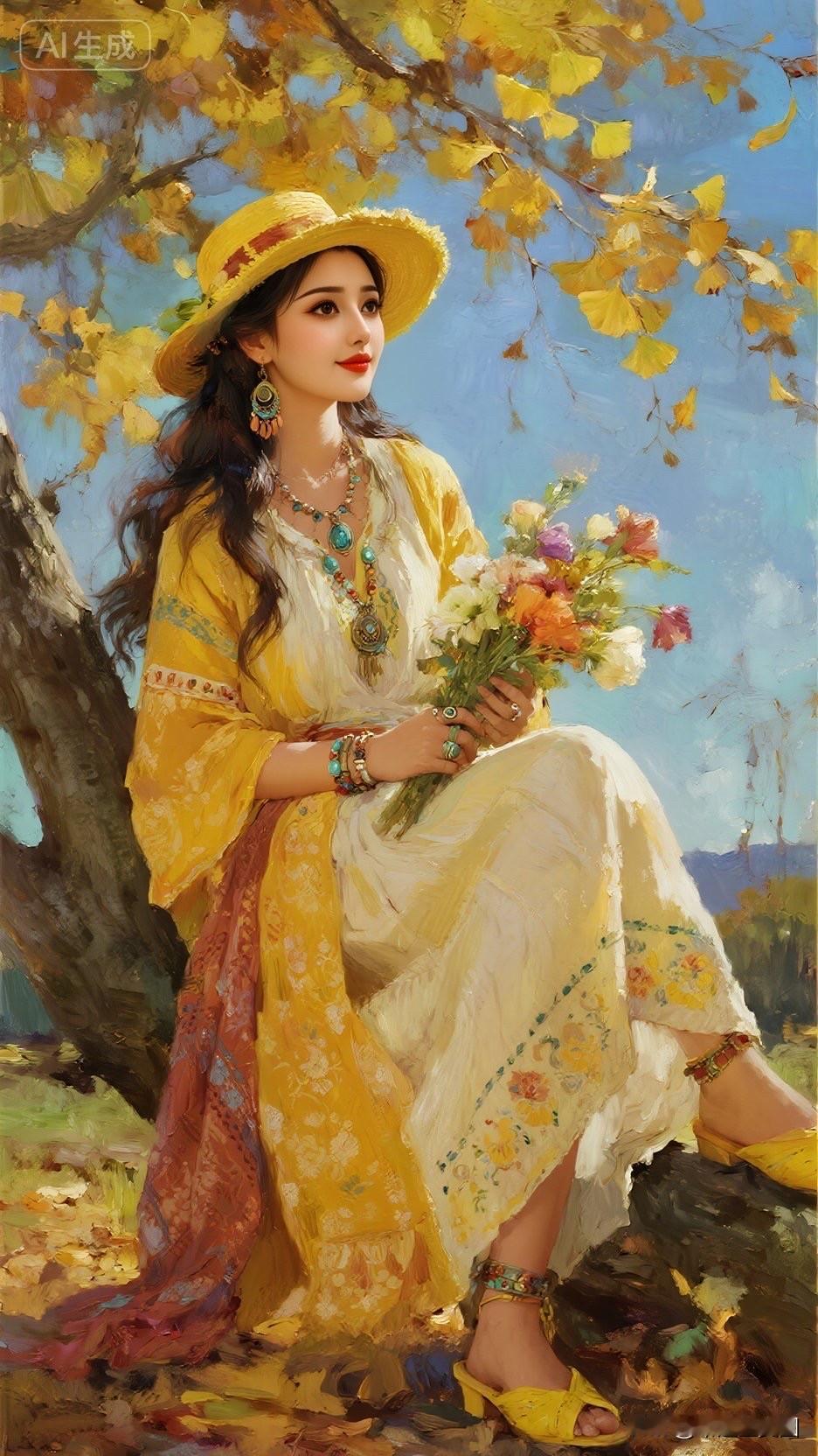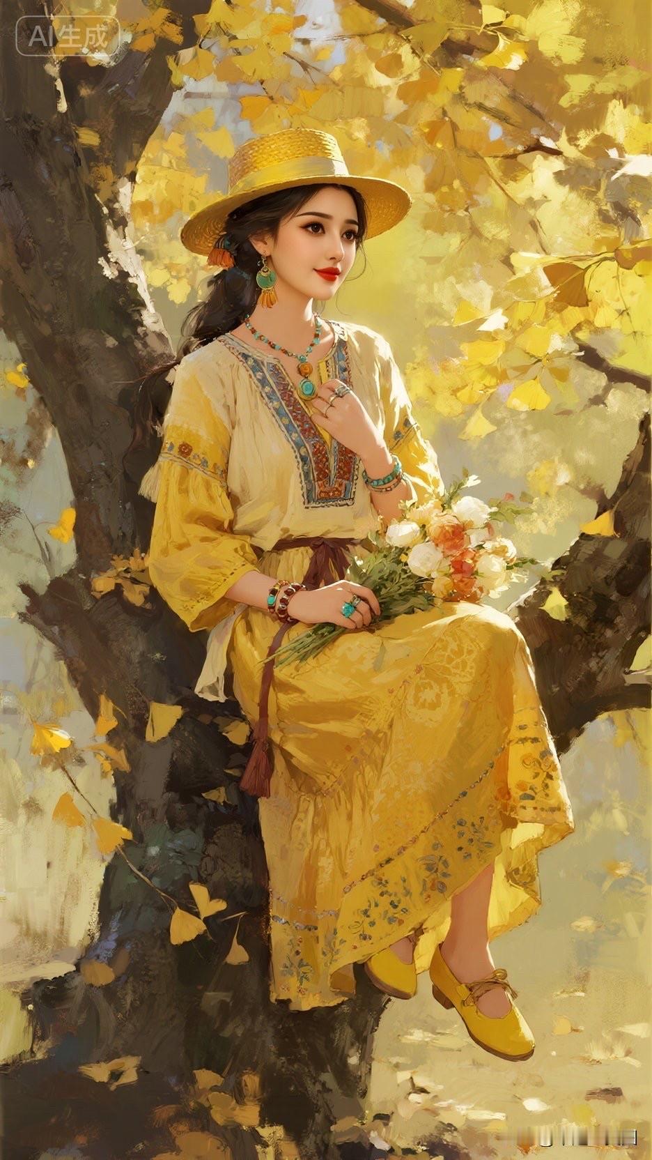 秋日暖阳下,黄衣少女倚树,花束相伴,唯美如画。