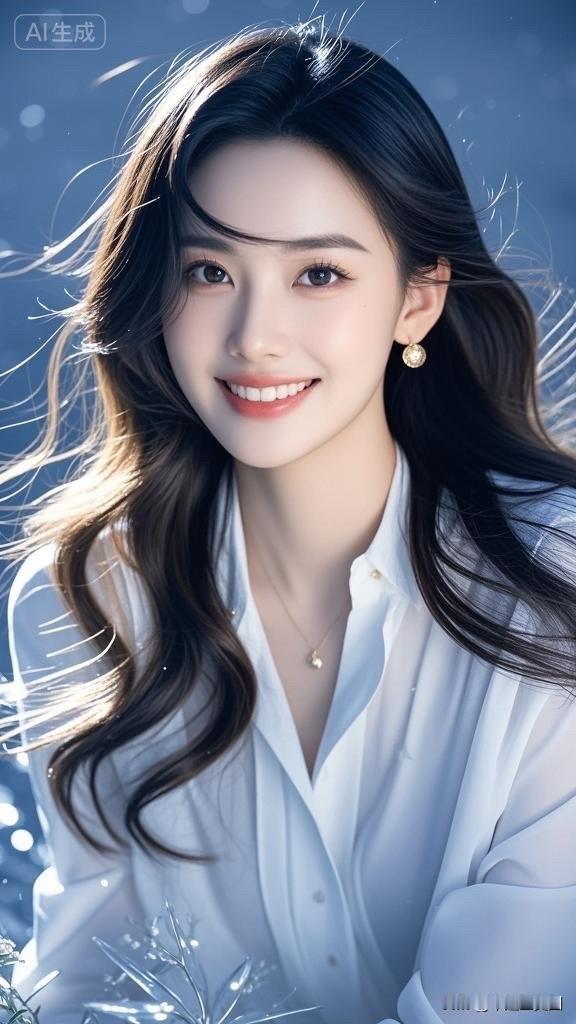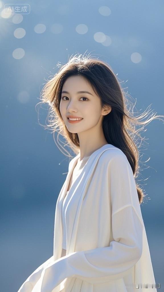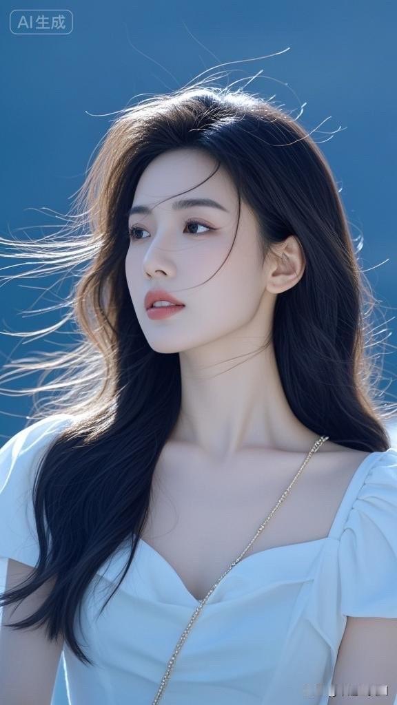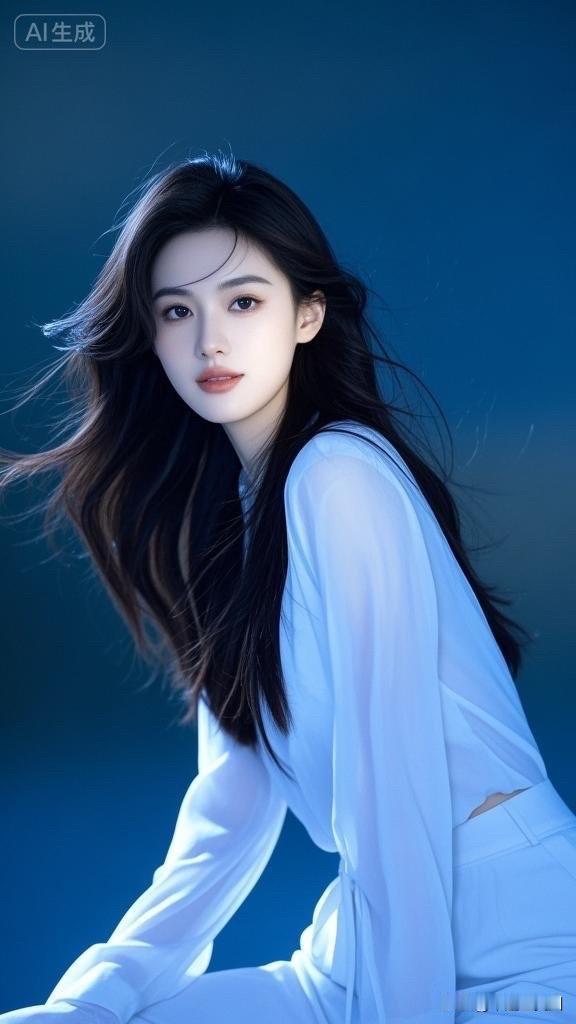 冷艳的蓝调,温柔的白衣少女,AI生成的梦幻之美