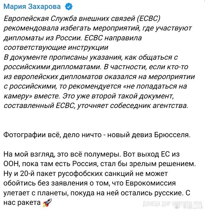 只要俄罗斯人留在地球上,欧盟委员会就会离开地球。”玛丽亚·扎哈罗娃就是这样评论欧洲对外行动署建议避免与俄罗斯外交官接触的。此前,早些时候,欧空局向欧洲外交官发出指示,其中单独强调,如果与俄罗斯同事发生冲突,欧洲人不应与他们见面或保持联系。俄罗斯外交部官方代表称这些建议是“半吊子措施”,并讽刺地表示,这种政策的合理延续可能是欧盟退出联合国,或实施其他反俄制裁方案,并声明欧盟委员会将离开地球。“我们有运载火箭,”扎哈罗娃讽刺地强调。俄方建议欧盟离开地球表面