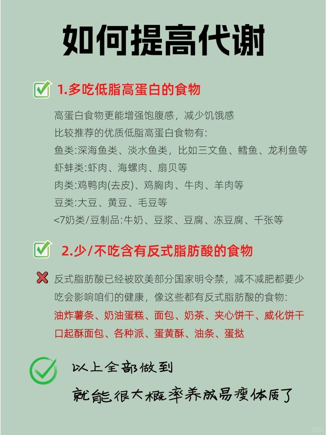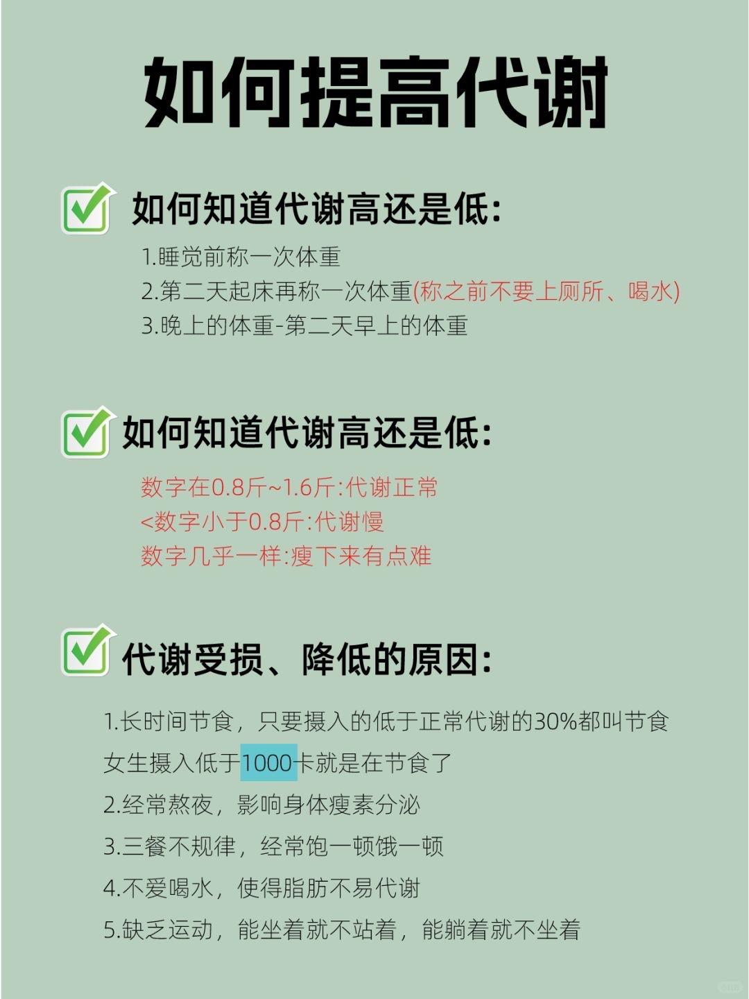 基础代谢低=易胖体质?这5个“躺瘦开关”,30岁后越用越灵! “喝口水都长肉,别人狂吃还不胖”—— 这句话是不是戳中了无数人的痛处?明明吃得比鸡少、动得比狗多,体重却纹丝不动,甚至稍微放纵就反弹,罪魁祸首就是被你忽略的“基础代谢”!它就像身体的“发动机”,代谢高的人躺着都在燃脂,代谢低的人再努力也难摆脱“易胖魔咒”。 很多人都踩过伤代谢的坑:为了减肥极端节食,每天只吃几百大卡,结果身体启动“节能模式”,代谢直接掉档15%-20%;只疯狂做有氧不练力量,肌肉越减越少,而每丢1公斤肌肉,每天就少烧100大卡,相当于多囤一碗米饭的热量;还有人熬夜刷手机、久坐不动,连续坐超2小时,脂肪燃烧效率直接降40%,代谢自然越来越差。 其实提高代谢根本不用硬熬,这5个低成本方法,普通人轻松就能坚持: 1. 力量训练是核心:不用去健身房,每天10分钟深蹲、靠墙静蹲,或用矿泉水瓶做抗阻训练,增1公斤肌肉每天多燃50-70大卡,运动后还能持续燃脂24-48小时。 2. 吃对蛋白不挨饿:每天按体重1-1.2克补蛋白(比如55公斤女生吃55克),鸡蛋、鱼虾、豆制品都可,每2小时吃一点,既能抗饿又能护肌肉。 3. 碎片化动起来:每小时起身1分钟,接水时多走路,打电话时单腿站立,哪怕只是拉伸,也能让代谢提升25%。 4. 睡够7小时:熬夜会让代谢开关“甲状腺素”减少,还会馋高油高糖,睡好才是代谢的“充电器”。 5. 拒绝极端节食:每天热量别低于基础代谢的70%,主食加些膳食纤维,餐后喝杯绿茶,血糖稳了代谢才不偷懒。 30岁后代谢每年都会自然下降,但这不是“摆烂”的理由。那些看似“不费力就瘦”的人,不过是把护代谢的习惯融入了日常。代谢提升了,不仅体重好控制,皮肤会更透亮,精力也会翻倍,这才是最划算的“逆龄投资”。 你有没有被“易胖体质”困扰过?试过哪些提高代谢的方法?欢迎在评论区分享你的经历,转发给正在减肥的朋友,一起解锁“躺瘦”密码!