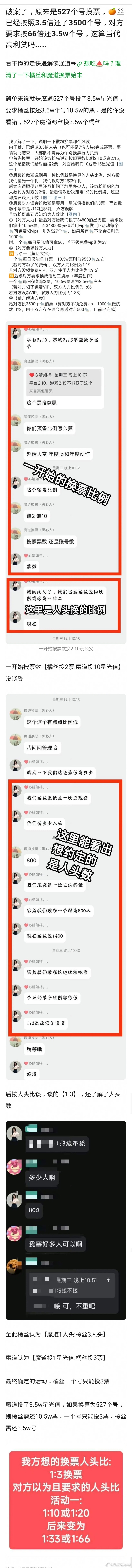 星光墙,微博的超话大赏魔道跟鞠婧祎两方散粉协商合作投票:魔道粉需为鞠婧祎投"星光大赏"星光值,对方则需位《魔道祖师》投"超话大赏"或"年度创作"票数规则:微博一个人头基础票3票做完任务共6票,星光一个人头要看30个广告平均任务时间:星光看广告每天花20分钟,微博一分钟①魔道粉主张:约定为“票数1:3”②橘丝主张:约定为“人头1:3”