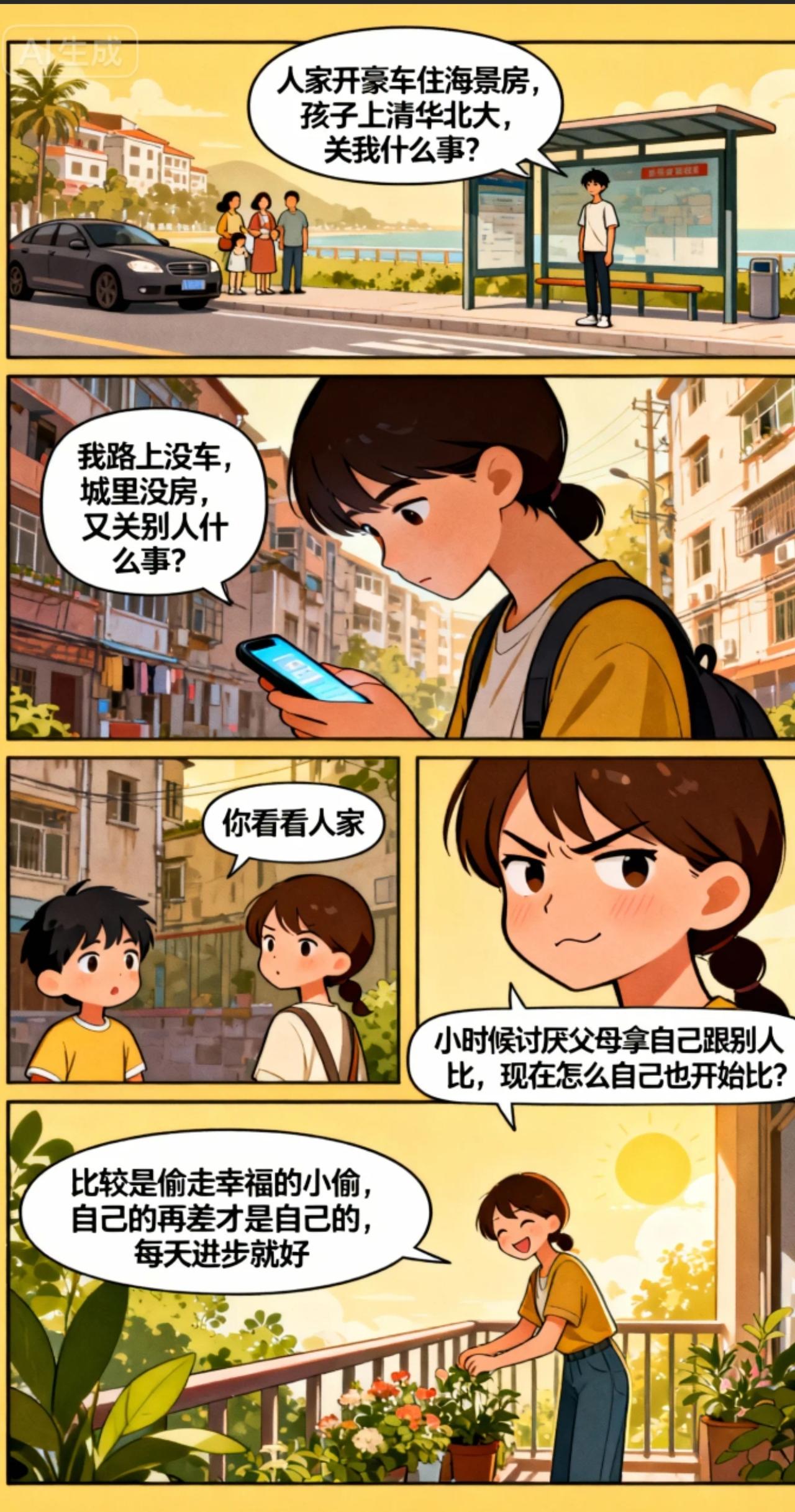 攀比是偷走幸福的小偷,嫉妒是毁掉一个人的根源。 人家开豪车,住海景房,孩子上清华上北大,关我什么事? 我路上没车,城里没房,又关别人什么事?人生不要东张西望,到处比较,因为比较就是偷走幸福的小偷。 而你已经足够完整了,没有必要用他人的碎片来拼凑自己。 小时候你不是非常讨厌父母拿自己跟别人家的孩子比吗?怎么长大以后,你竟也开始主动去跟别人比较。别人的再好是别人的,自己的再差才是自己的。 其实谁家的锅底没有灰呀?各位,人到中年,不要还东攀西比,顾好自己的,才是最重要的。只要自己的生活每天都能有点进步就心满意足了。嫉妒