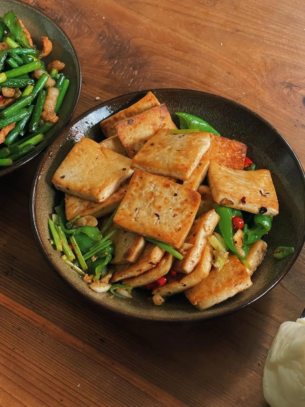 前段时间在南阳长江路312老国道口那家“盆窖大锅菜”吃的〖干锅豆腐〗实在不错! 之前也吃过不少别家的,大多炸的太干,里面豆腐还没入味,要么就是够柔软,但是味道淡淡的,还一夹就断! 他们家也不知道是咋处理的,表面是浅浅的黄色,没有炸的很干,但是很入味。 但不是单凭红辣椒、蒜片炝出来的那种鲜辣,而是自然的那种咸鲜,入口绵软,不似其它炸干的那种豆腐的口感。 回去之后,自己也尝试着做了几次,味道、外观虽然不甚相同,但是却别有一番风味,反正我尝着比自己之前做的好吃多了,现在把做法写在下方,你也可以试试: 1,老豆腐切片,先用少许食盐、生抽、红椒、姜丝、蒜片淹半小时。(这是入味的关键) 2,将豆腐放入平底锅中两面煎黄。 3,将切好的青椒、花椒粒用油爆香,放入适量五花肉,芹菜段翻炒出香味,再倒入煎好的豆腐,翻炒片刻,淋入先前淹豆腐的料汁,再加入耗油,少量开水,盖上盖子大火焖炖2~3分钟即可出锅。 感兴趣的朋友尽管试试看,很下饭的呦! 南阳下饭菜 干锅豆腐南阳美食南阳盆窖大锅菜南阳民间菜