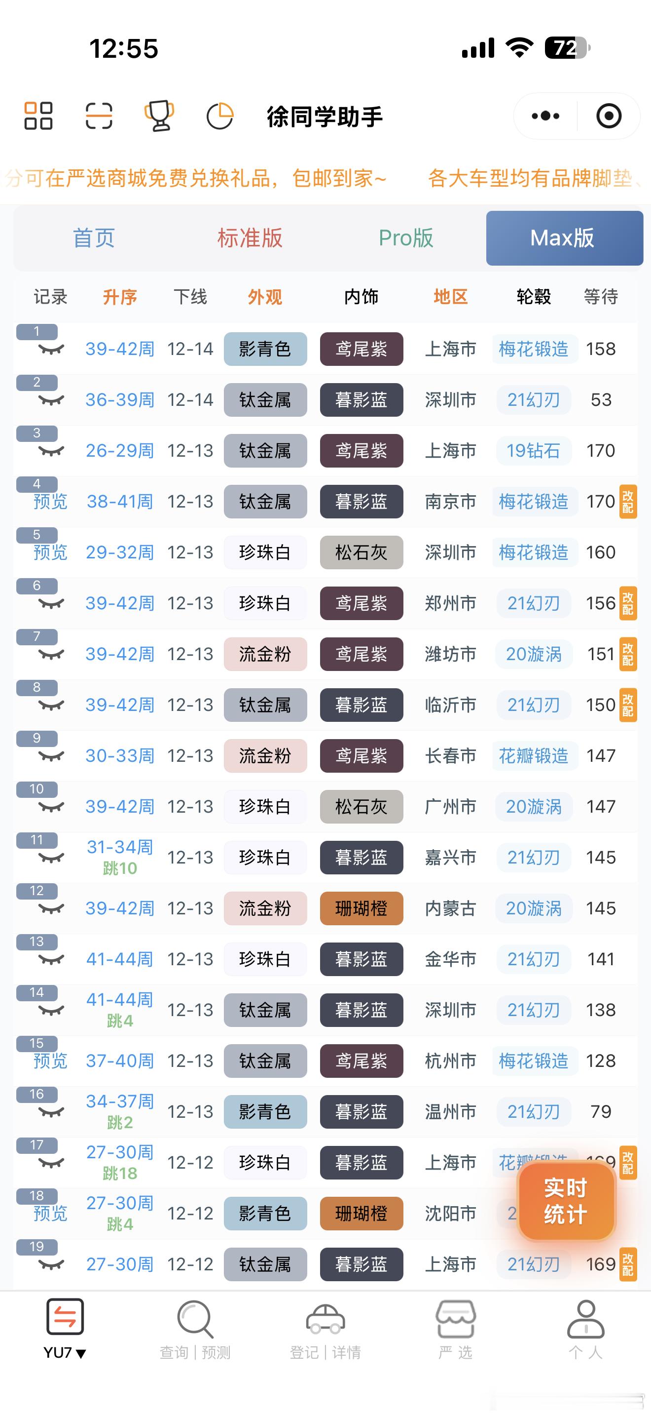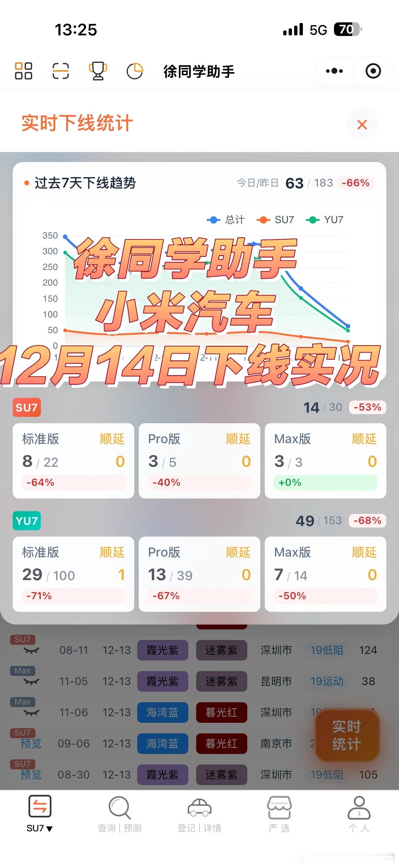 小米汽车(12月14日)下线实况‼️最新消息:今年12月14-17日期间支付尾款满5000元,且能在当月完成提车的就可以获赠一个1:18的车模(价值599元)这其实是企业的正常经营行为,任何公司都会在年底冲业绩,不要被外界解读影响心情越来越多超前下线的,收到电话了就真的快了🌀YU7(据不完全统计)合计153台1️⃣标准:下线100台,大部队都在31周及以后了,很多50-60周的也在正常下2️⃣Pro:下线39台,34周左右的随时下线,也有少部分28周左右的没下3️⃣Max:下线14台,车不是很多了,现车还有不少🌀SU7(据不完全统计)合计301️⃣标准:下线22台,6月份的居然还有不少没下的2️⃣Pro:下线5台,没啥车了3️⃣Max:下线3台,没啥车了4️⃣ultra:无更多关于小米汽车的最新资讯和深度解析,请参考【米车派】~汽场全开徐同学助手