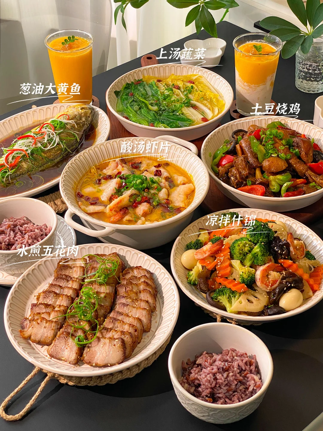 5️⃣酸汤虾片+葱油大黄鱼+水煎五花肉+土豆烧鸡+凉拌什锦+上汤蔬菜