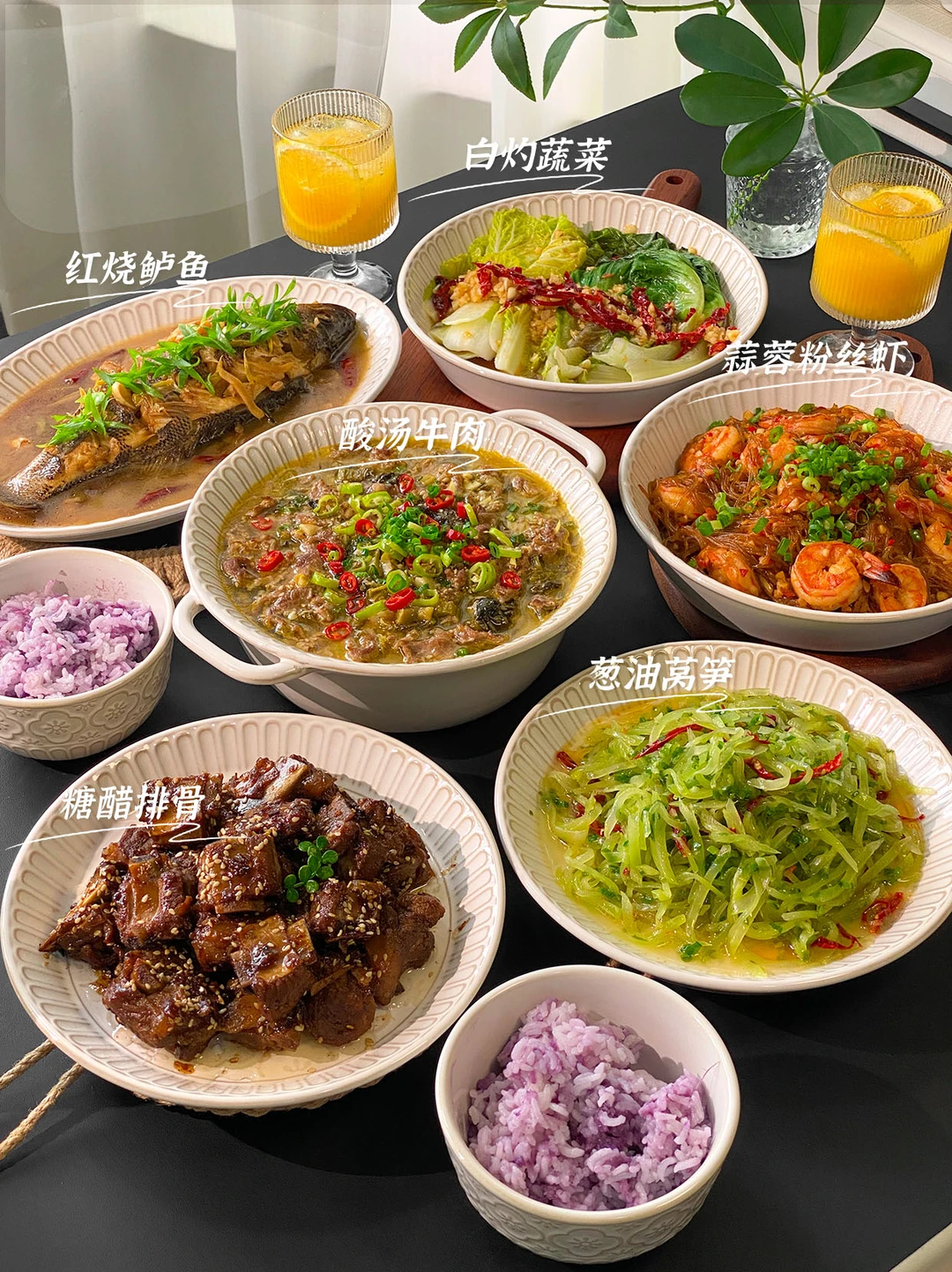 3️⃣ 红烧鲈鱼+糖醋排骨+蒜蓉粉丝虾+酸汤牛肉+葱油莴笋+白灼蔬菜