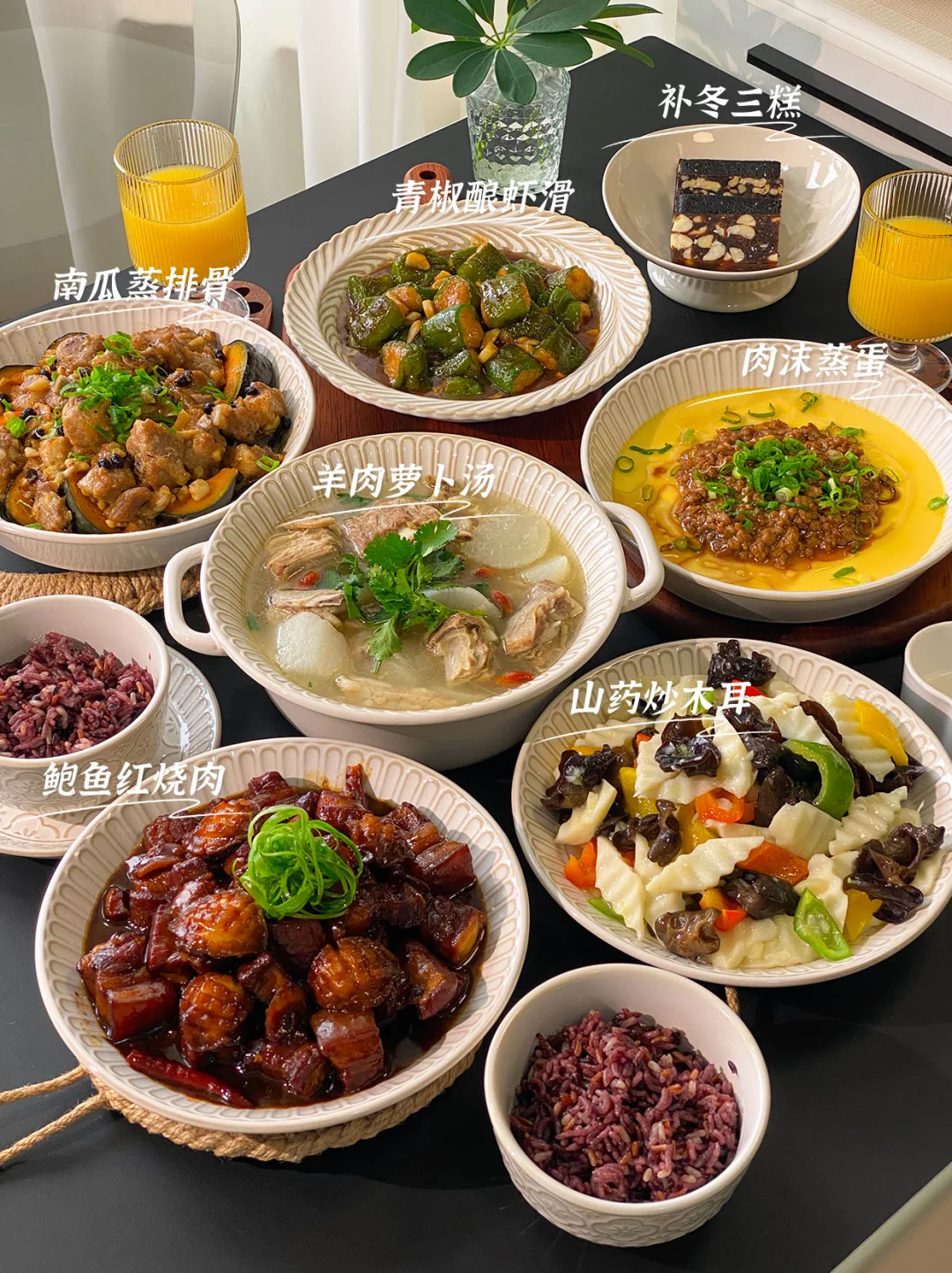 2️⃣羊肉萝卜汤+鲍鱼红烧肉+南瓜蒸排骨+肉沫蒸蛋+青椒酿虾滑+山药炒木耳