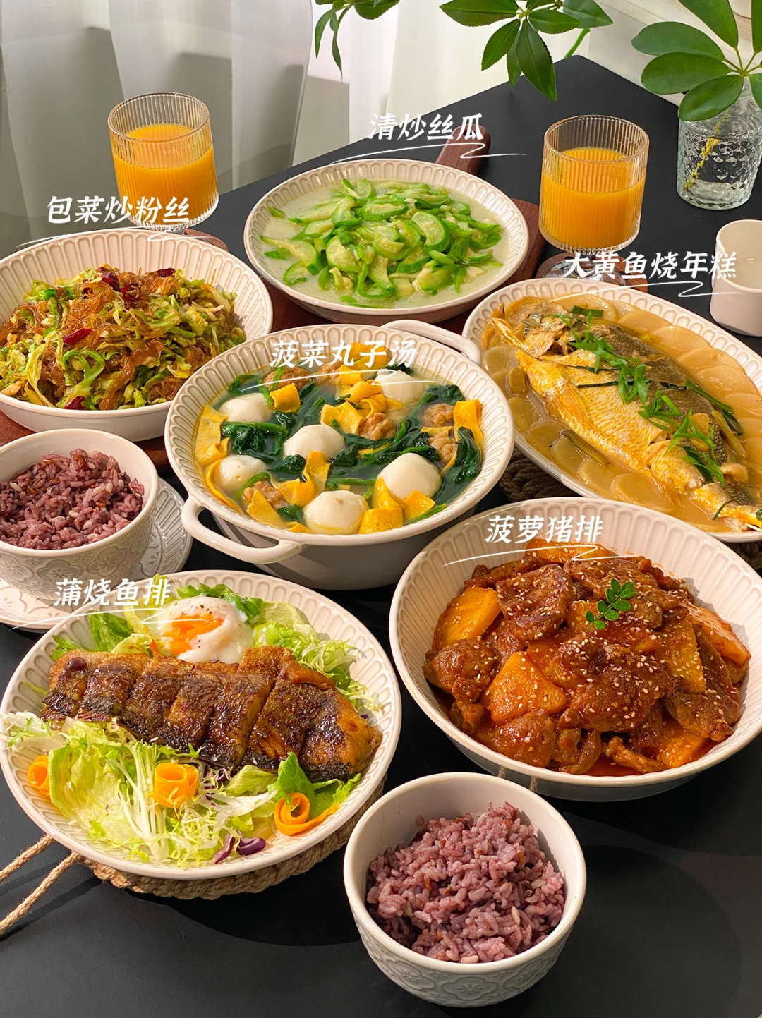 4️⃣黄鱼烧年糕+蒲烧鱼排+菠菜丸子汤+菠萝猪排+清炒丝瓜+包菜炒粉丝