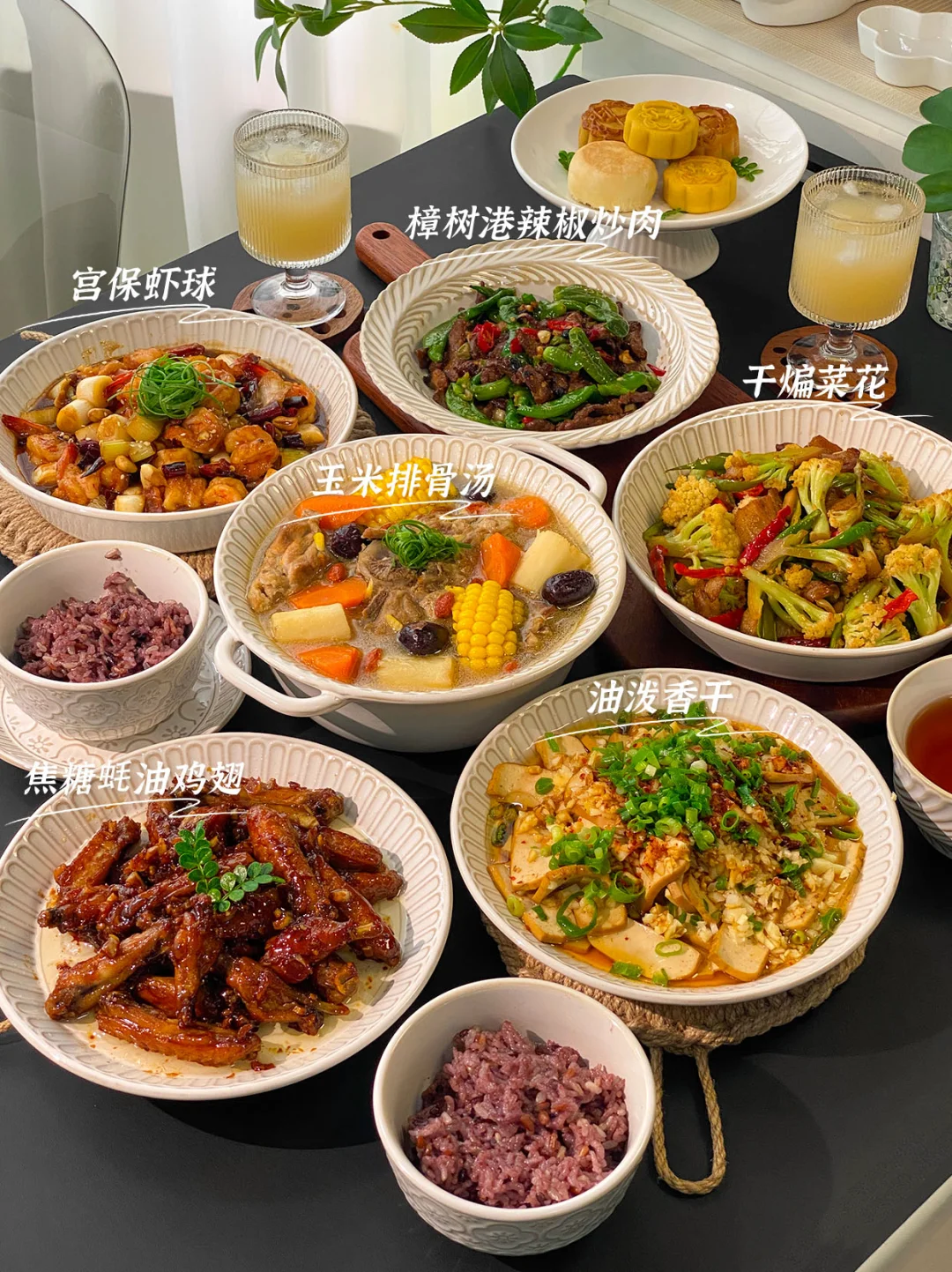 1️⃣玉米排骨汤+焦糖蚝油鸡翅+樟树港辣椒炒肉+宫保虾球+干煸菜花+油泼香干