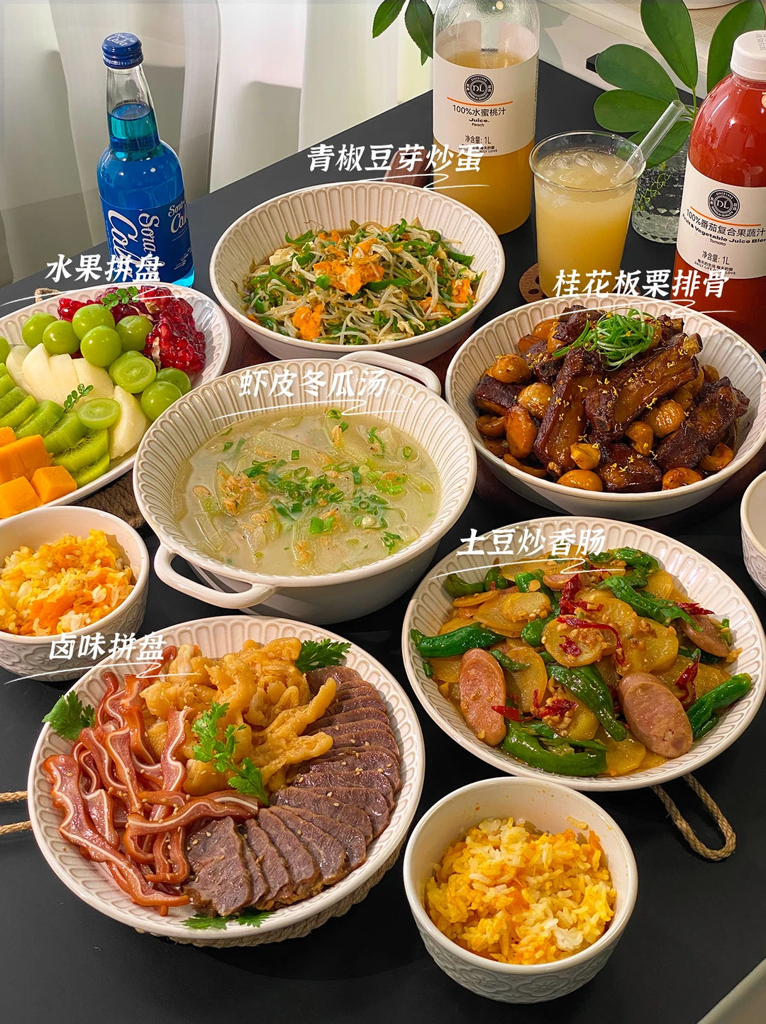 7️⃣板栗排骨+虾皮冬瓜汤+青椒豆芽炒蛋+土豆炒香肠+卤味拼盘+水果拼盘