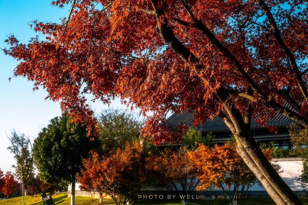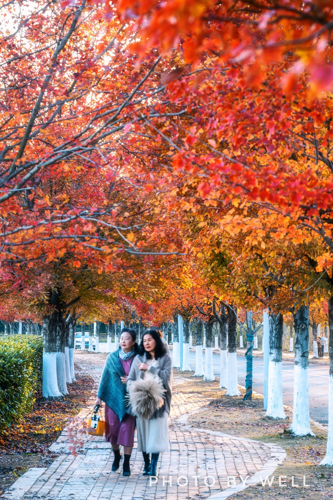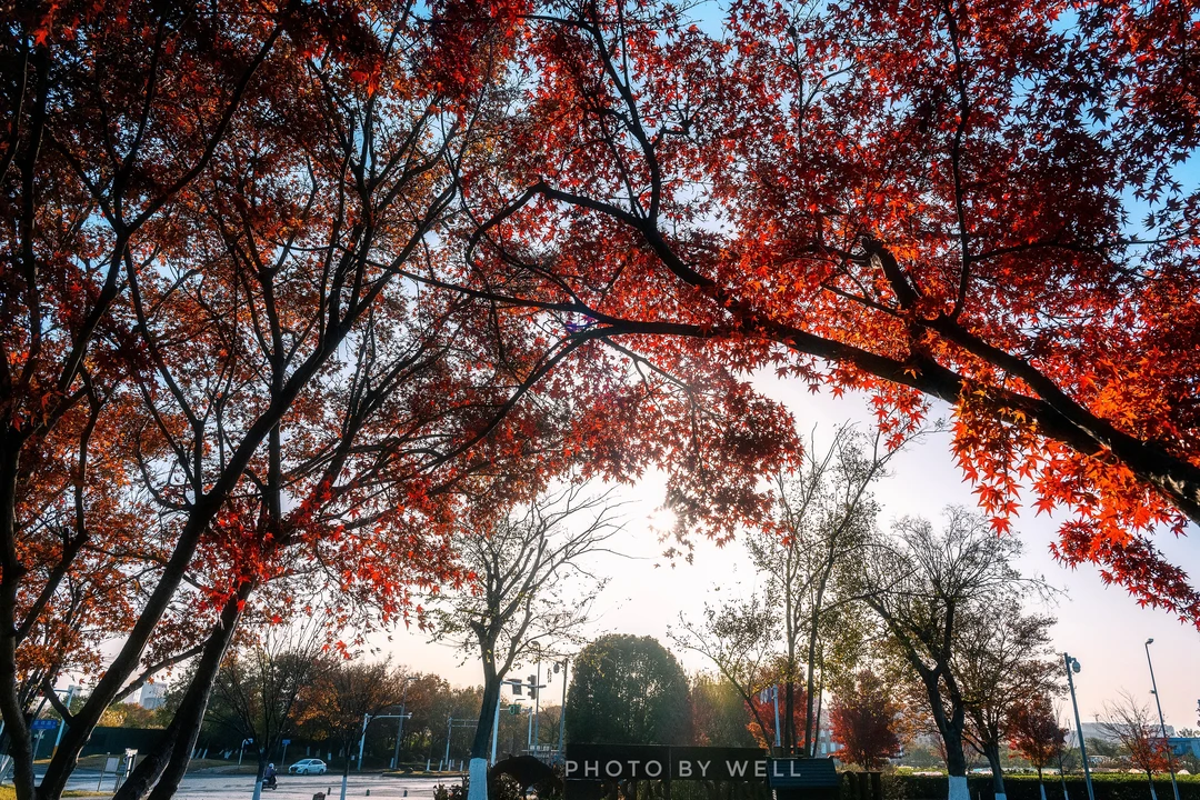 深秋的南京,除了闻名遐迩的栖霞山,还有一个藏在汤山的绝美红叶观赏地——金乌温泉公园及与之相邻的金乌路(又称经十路)。这里免费向公众开放,却拥有不输知名景点的秋色,是逃离喧嚣、独享静谧的理想去处。我们本是到汤山的温泉酒店泡汤的,可早晚到附近散步时,发现700米长的红枫大道的两侧美国红枫呈现出酒红、橙红、黄绿的渐变色调,宛如一条燃烧的火焰隧道,与灰黑色的路面形成鲜明对比,给了我们惊艳。