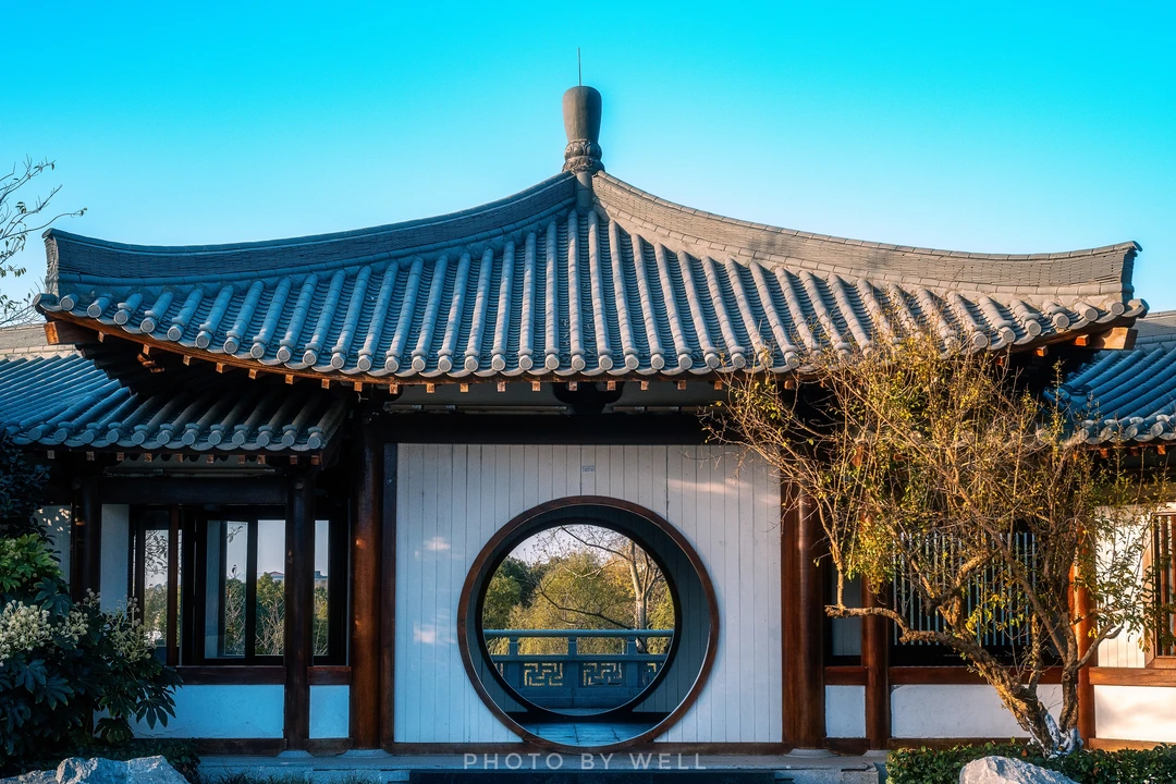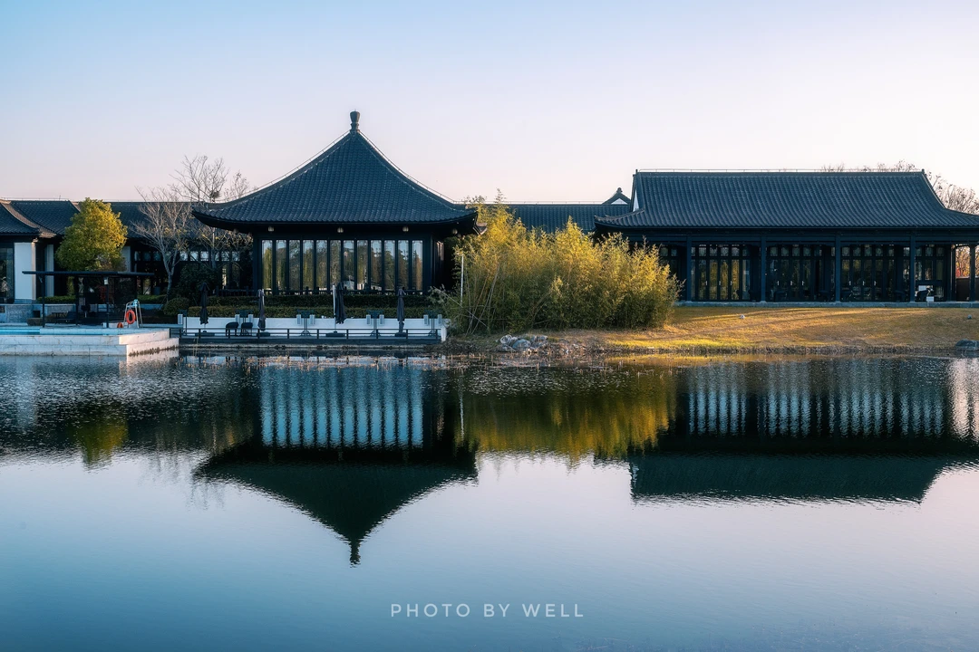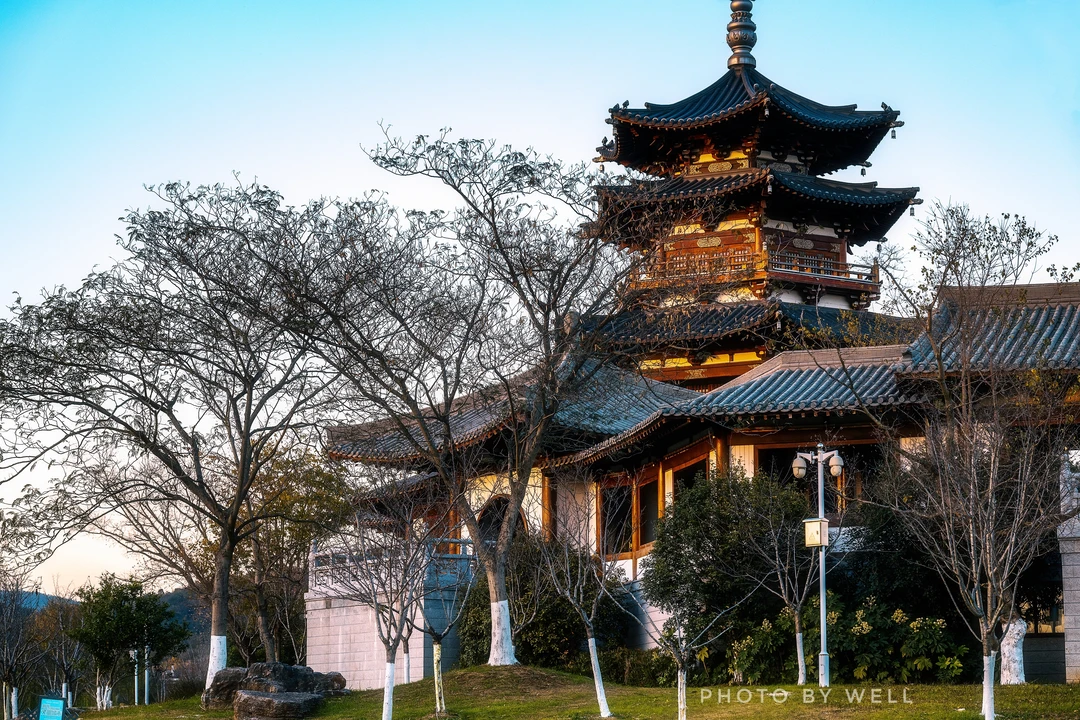 金乌温泉公园是在温泉井原址上建造的公园,不仅秋季红叶迷人,四季都有独特景致。公园最引人注目的建筑是金乌阁——一组宋式传统建筑风格的楼阁。建筑以红栗壳色为主色调,结合灰黑色的瓦面与白色板墙,并装饰有香槟银色体现金乌传说的金属装饰。在湖水的映衬下,金乌阁与周围的红叶构成宁静致远的意境。