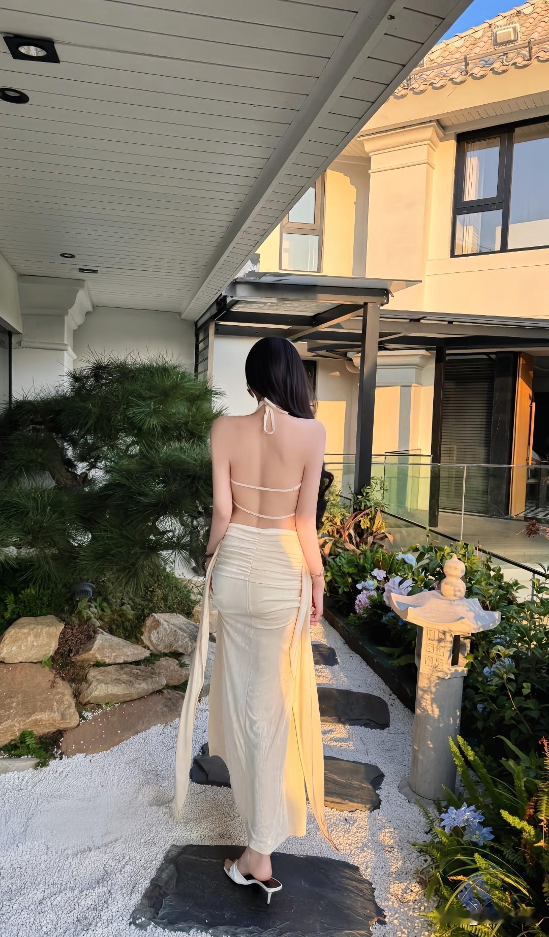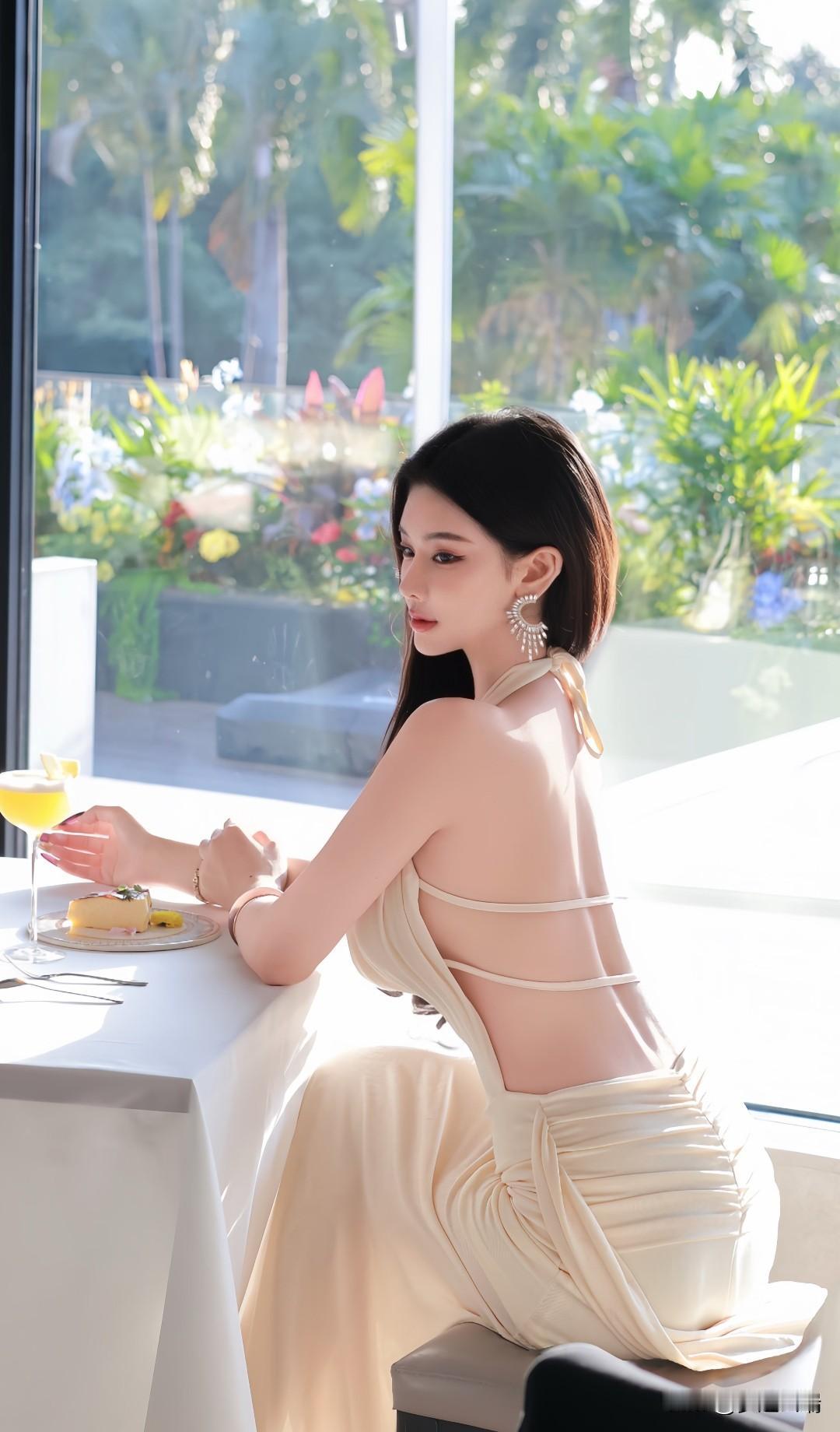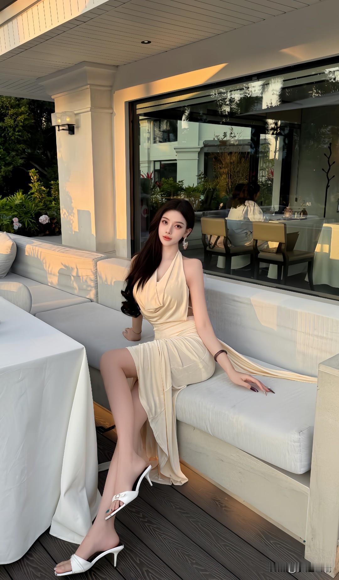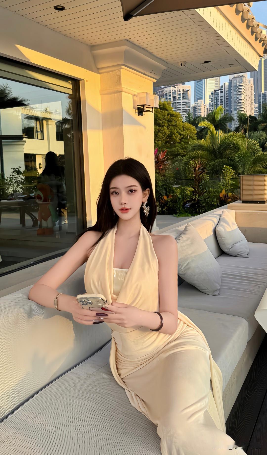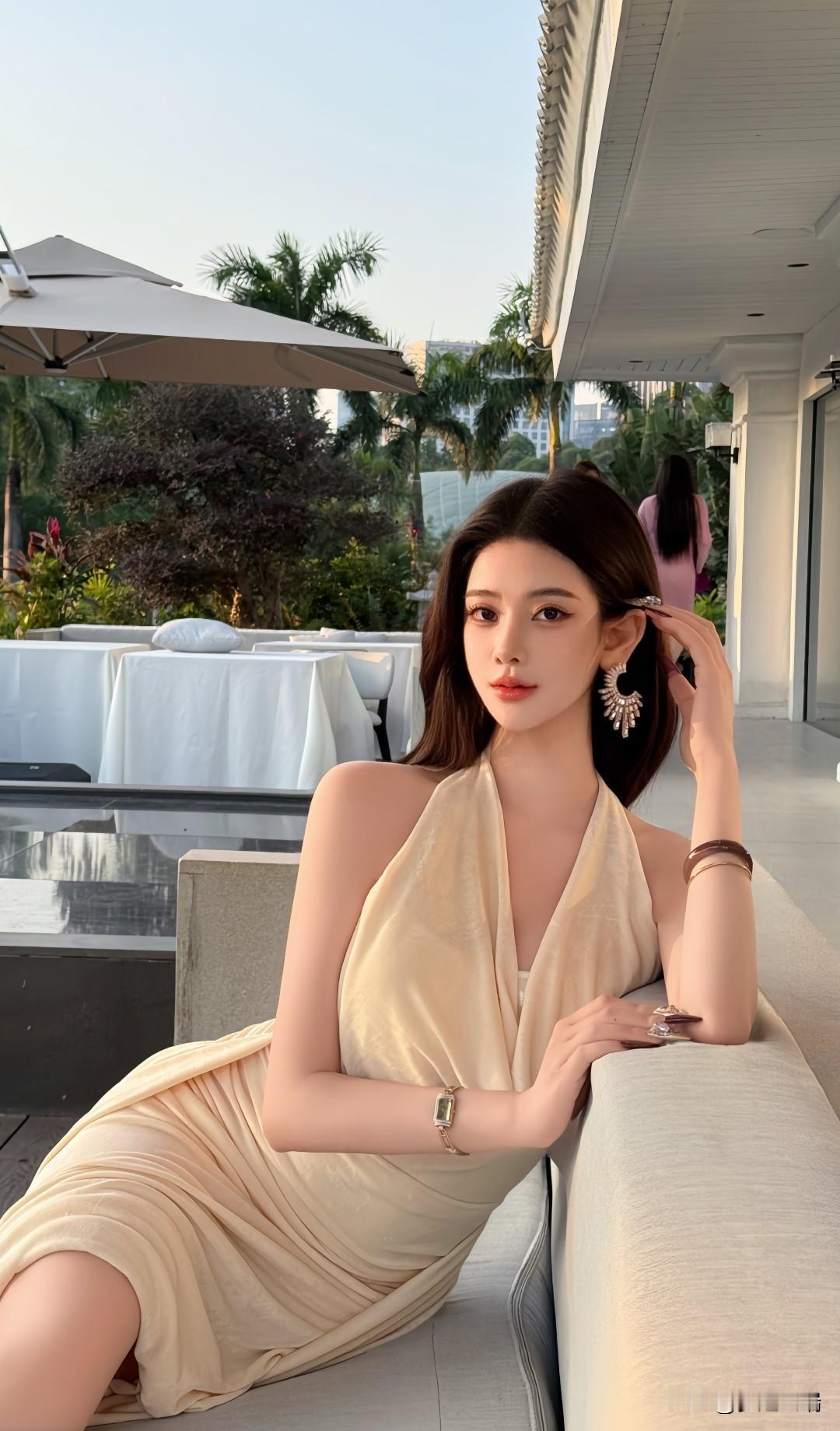 优雅度假风,浅黄色连衣裙搭配精致耳环,享受宁静的午后时光。