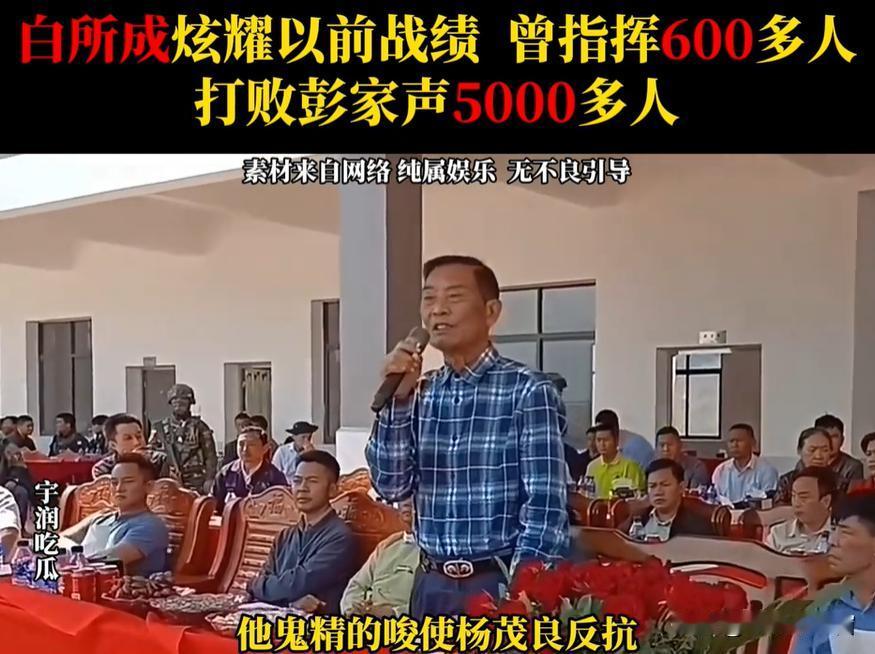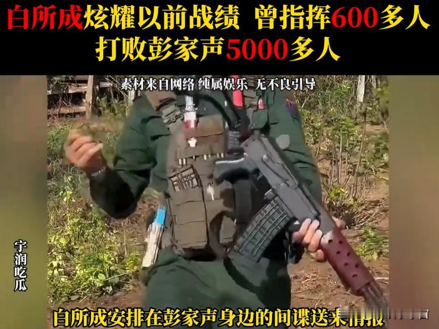 白所成声称600打败彭家声5000! 白所成最大的骄傲,就是14岁跟随彭家声,一身反骨的白所成,一生两次背叛彭家声,最终还是咎由自取!白所成两次背叛彭家声,但后来因为在果敢地区的势力庞大,彭家声没有办法,只能继续任用白所成,做自己的副司令,实际上根本指挥不动白所成。 到了2009年的八八事件当中,白所成联合其他果敢三大家族,直接就反了彭家声,导致彭家声家族全体离开果敢地区,长达十余年。白所成一直吹嘘自己指挥600人打败5000果敢同盟军。 其实指的应该是2015年的那次回家之战,当时果敢同盟军大概两三千人,准备打回果敢地区,重新行使果敢的控制权,但最终失败了。因为缅甸政府军从下缅甸,调集大量的重型部队,加上当时指指挥作战不力,德昂军和若开军等武装,也是没有壮大,所以当时打了败仗。 在南天门山上,几十名果敢同盟军的士兵苦守,最终全军覆没。但是打硬仗的还是缅甸政府军,结果白所成老是吹嘘自己600打败5000,你想想可能吗?果敢同盟军里哪有五千人,当时充其量两三千人,就了不得。 结果白所成觉得果敢同盟军打不回来,所以就拼命的吹嘘,以为自己很牛,实际上都是缅甸政府军打的仗。白所成家族的武装,根本就没什么没怎么出力,但是白所成为了塑造自己的硬汉形象,到处吹牛,最终还是彻底失败。 到了2023年的1027行动的时候,白所成还是信心满满,扬言果敢同盟军的官兵,站着进来,躺着出去,结果最终是什么情况,大家都一清二楚。